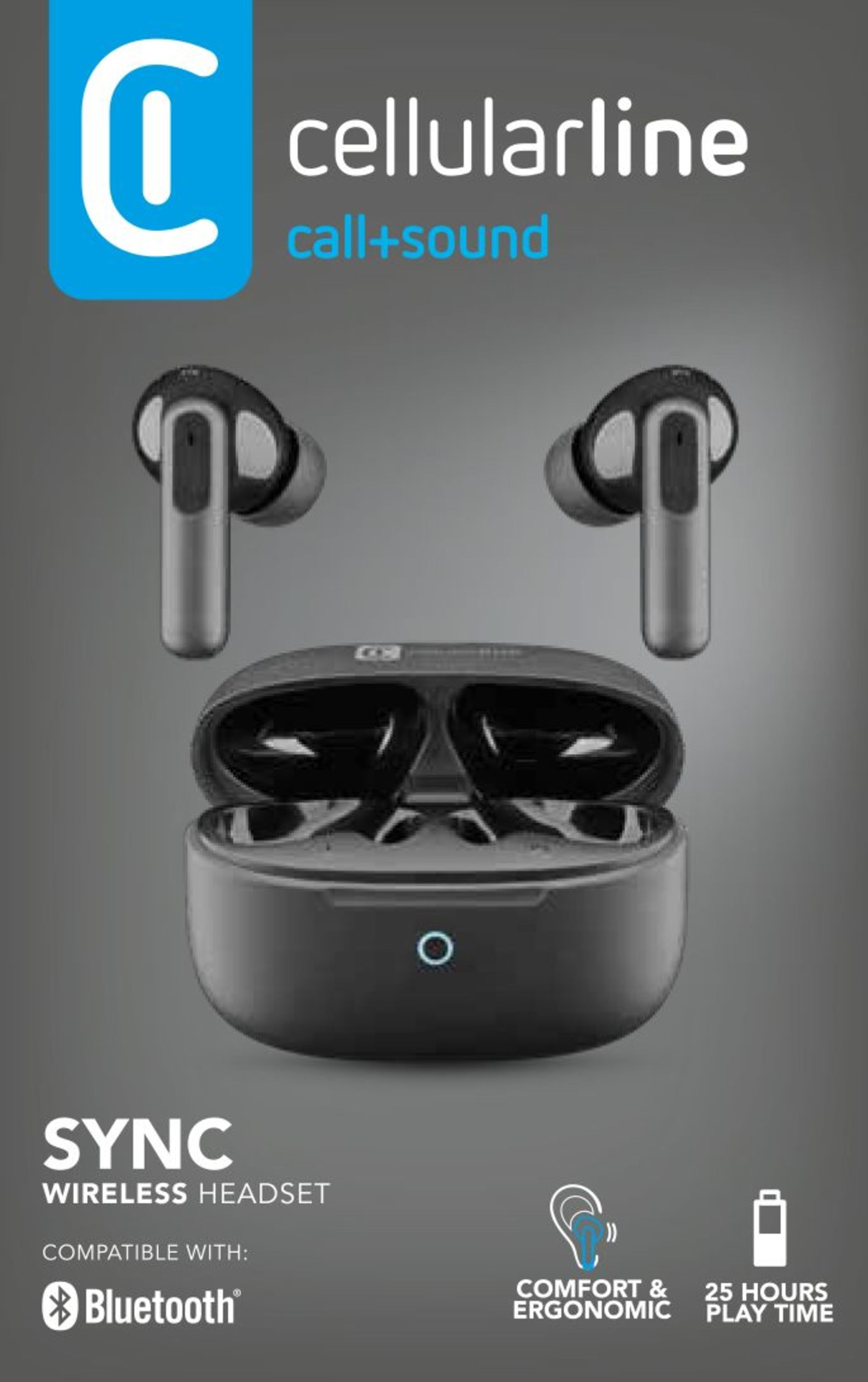 Cellularline Sync Auricolari TWS Bluetooth con custodia di ricarica. Tipo di prodotto: Auricolare. Tecnologia di connessione: True Wireless Stereo (TWS), Bluetooth. Utilizzo raccomandato: Musica e Chiamate, Lunghezza cavo: 0,15 m. Peso: 100 g. Colore del prodotto: Nero