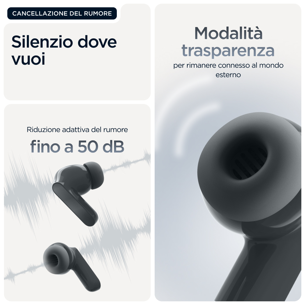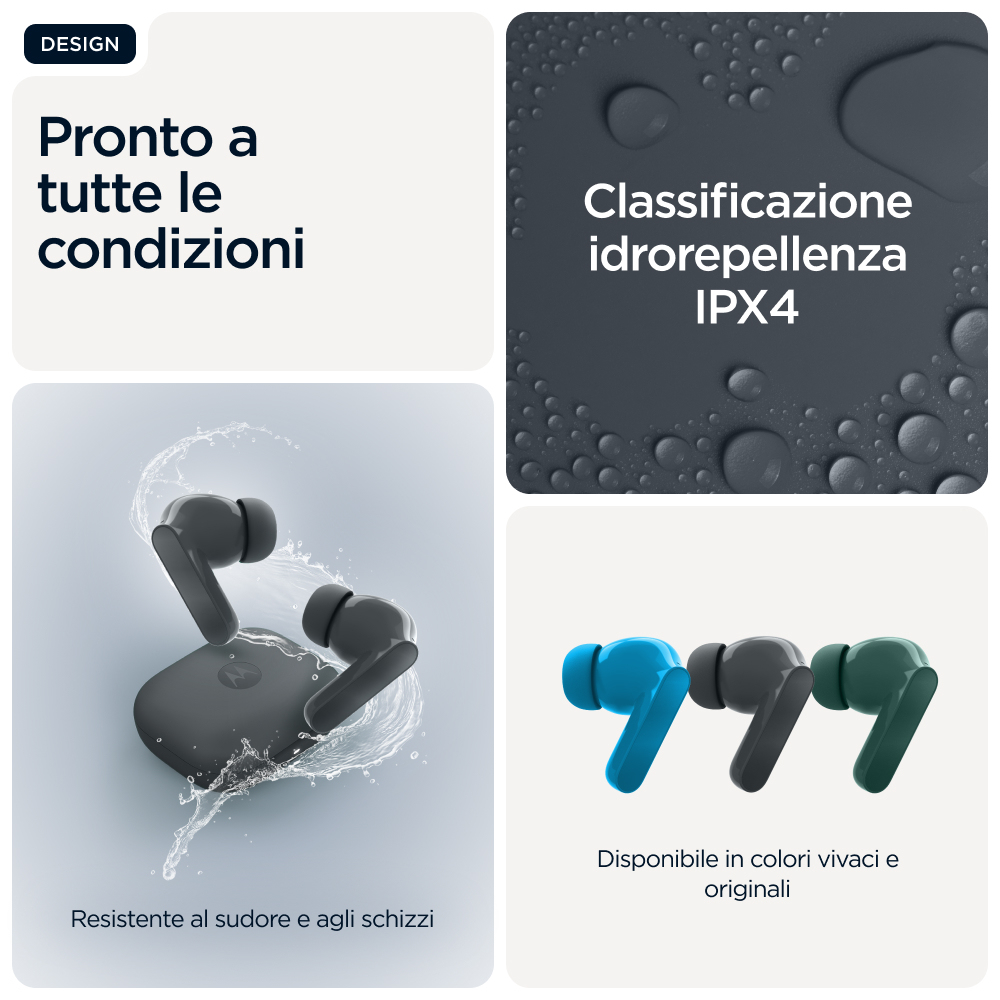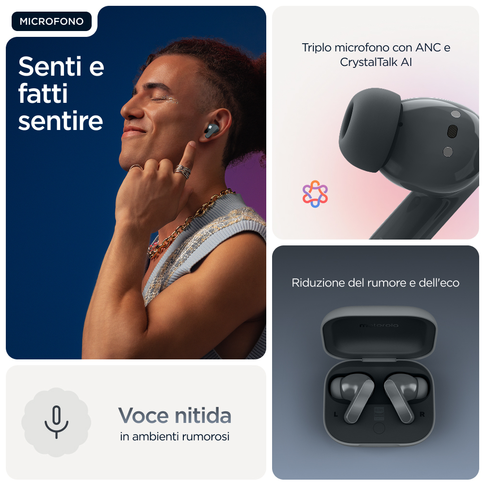 Che si tratti del drop nel tuo brano preferito o del ritmo che ti tiene in movimento, il basso è qualcosa che dovresti sentire. Motorola presenta i moto buds bass, con un ampio driver dinamico appositamente ottimizzato per bassi profondi e potenti e audio ad alta risoluzione.(1) Immergiti nella musica e nei film con un audio profondo e di impatto e bassi ricchi che animano ogni beat. Escludi il mondo attorno a te o mantieni la percezione dell'ambiente che ti circonda durante l'ascolto con l'eliminazione attiva e dinamica del rumore. Goditi chiamate vocali cristalline grazie al sistema con tre microfoni su ogni auricolare. Personalizza e controlla facilmente la tua esperienza di ascolto con l'app Moto Buds.(8) Oltre a tutto ciò, infinite ore di autonomia, ricarica rapida e design idrorepellente.(2) Senti il ritmo prendere vita con i moto buds bass.