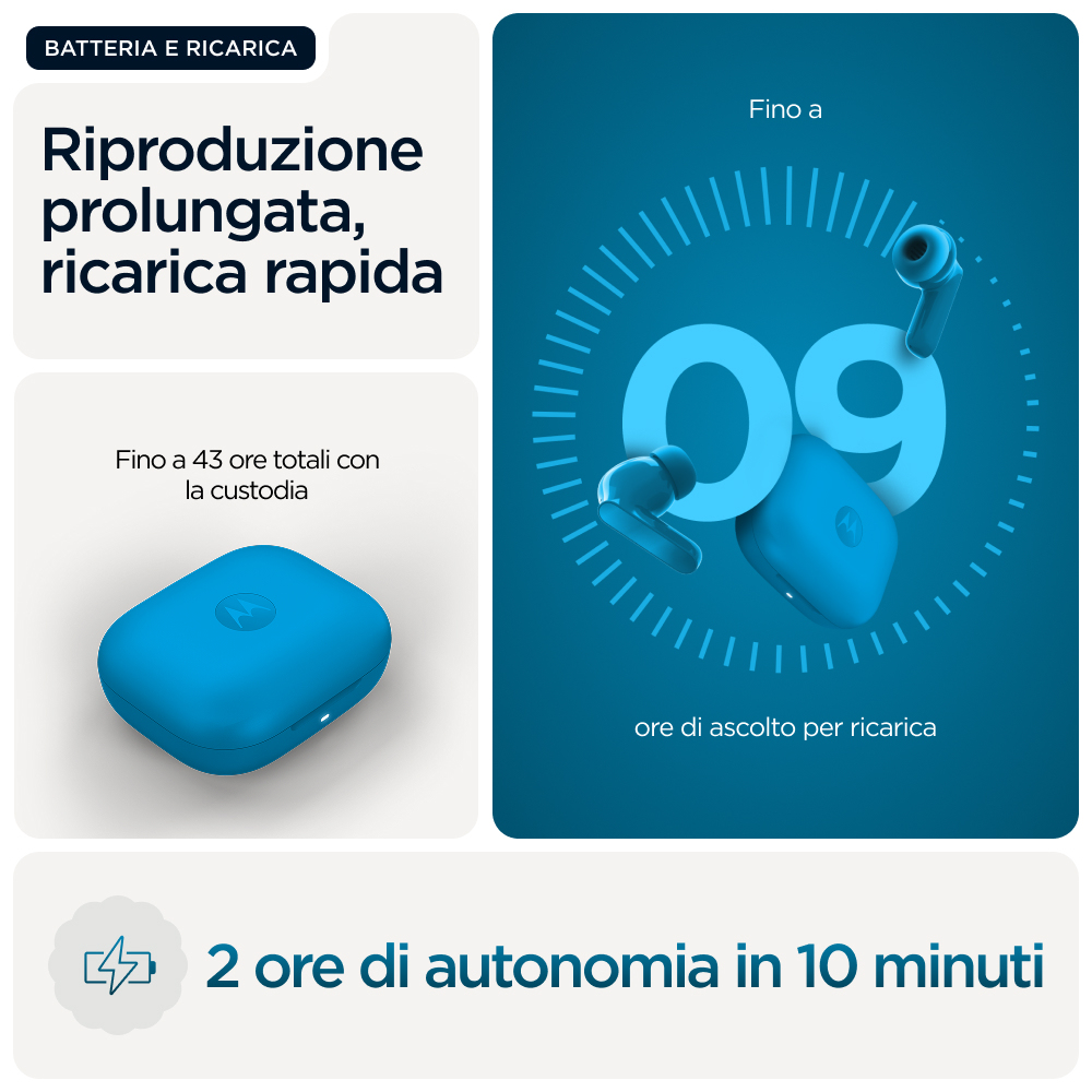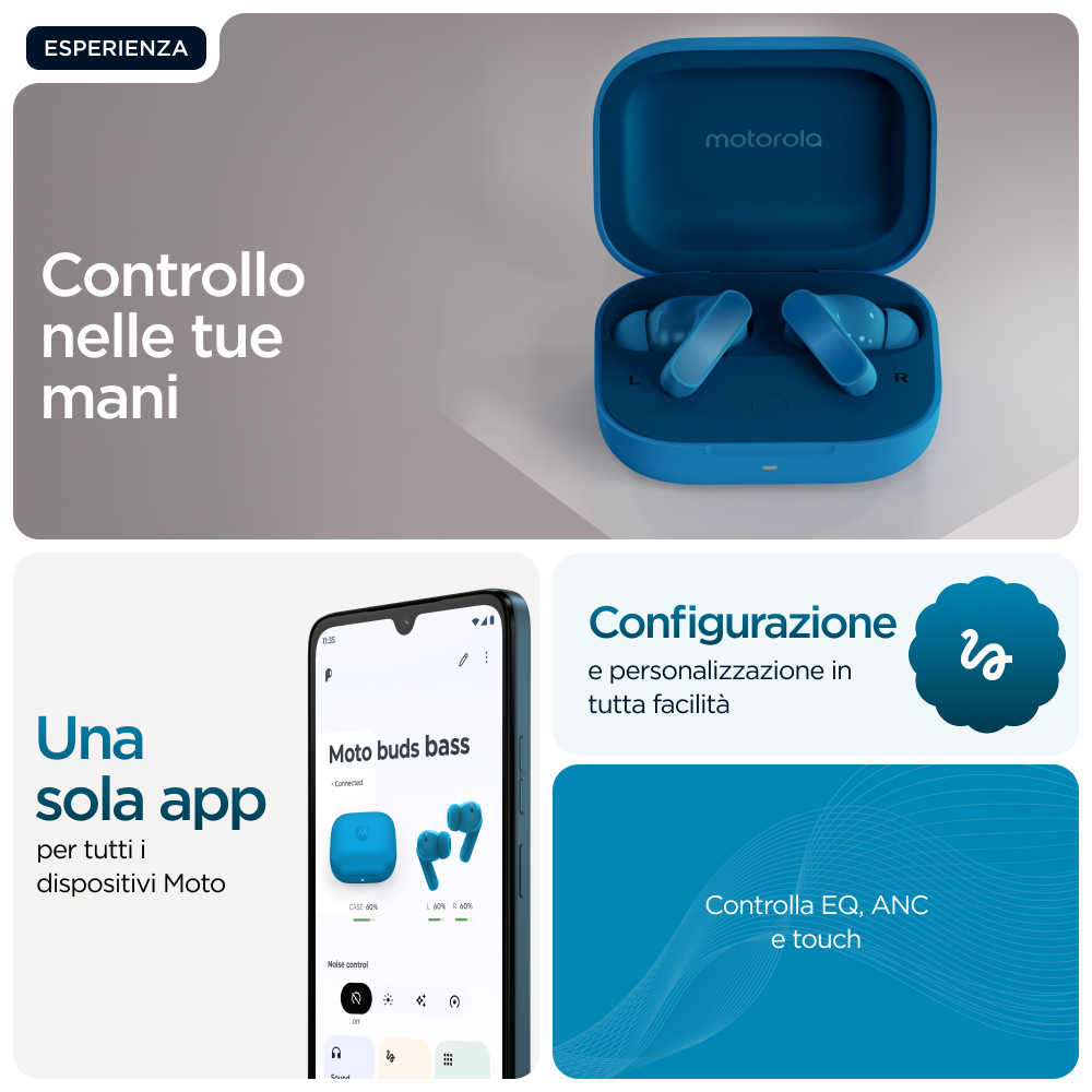 Che si tratti del drop nel tuo brano preferito o del ritmo che ti tiene in movimento, il basso è qualcosa che dovresti sentire. Motorola presenta i moto buds bass, con un ampio driver dinamico appositamente ottimizzato per bassi profondi e potenti e audio ad alta risoluzione.(1) Immergiti nella musica e nei film con un audio profondo e di impatto e bassi ricchi che animano ogni beat. Escludi il mondo attorno a te o mantieni la percezione dell'ambiente che ti circonda durante l'ascolto con l'eliminazione attiva e dinamica del rumore. Goditi chiamate vocali cristalline grazie al sistema con tre microfoni su ogni auricolare. Personalizza e controlla facilmente la tua esperienza di ascolto con l'app Moto Buds.(8) Oltre a tutto ciò, infinite ore di autonomia, ricarica rapida e design idrorepellente.(2) Senti il ritmo prendere vita con i moto buds bass.