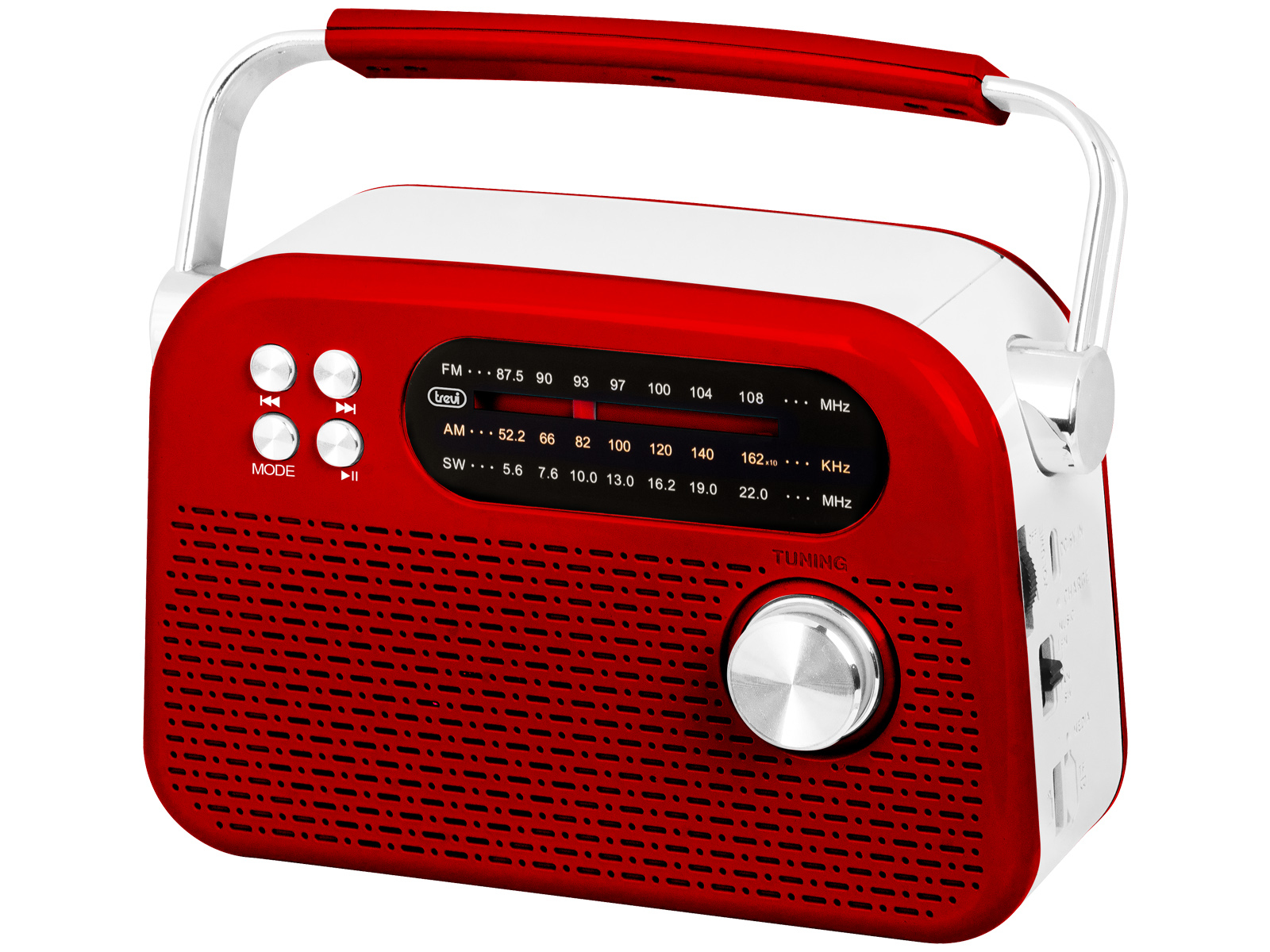 Trevi Radio Wireless Portatile Multibanda USB Micro SD RDA 70 BR Rosso. Tipo radio: Portatile, Tipo sintonizzatore: Analogico, Bande del sintonizzatore: AM, FM, SW. Connettore USB: USB tipo-C. Colore del prodotto: Rosso, Colorazione: Monocromatico, Controllo del volume: Manopola. Tipi schede di memoria: MicroSD (TransFlash). Tecnologia batteria: Litio