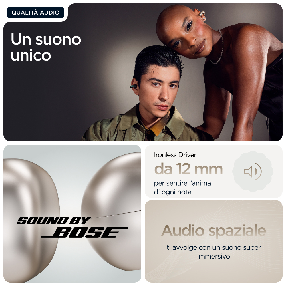 Ti presentiamo Moto Buds Loop, gli auricolari eleganti e leggeri progettati per migliorare la tua esperienza audio mantenendola connessa al mondo che ti circonda. Grazie al design open-ear, il modello Moto Buds Loop vanta il look che desideri, ma con il comfort per tutto il giorno di cui hai assolutamente bisogno. Mantieni il controllo della tua giornata frenetica senza perdere alcun dettaglio associando gli auricolari a dispositivi con tecnologia Moto AI.(1) Ascolta con suoni incredibilmente chiari e bilanciati grazie a Sound by Bose. Prova chiamate cristalline con il sistema di microfoni avanzato. E ottieni protezione costante grazie ai materiali premium e al design idrorepellente.(2) Con autonomia senza interruzioni fino a 8 ore(3) e ancora di più tramite la custodia, hai tutta la potenza che ti serve. Gli auricolari Moto Buds Loop sono sempre in sintonia con te.