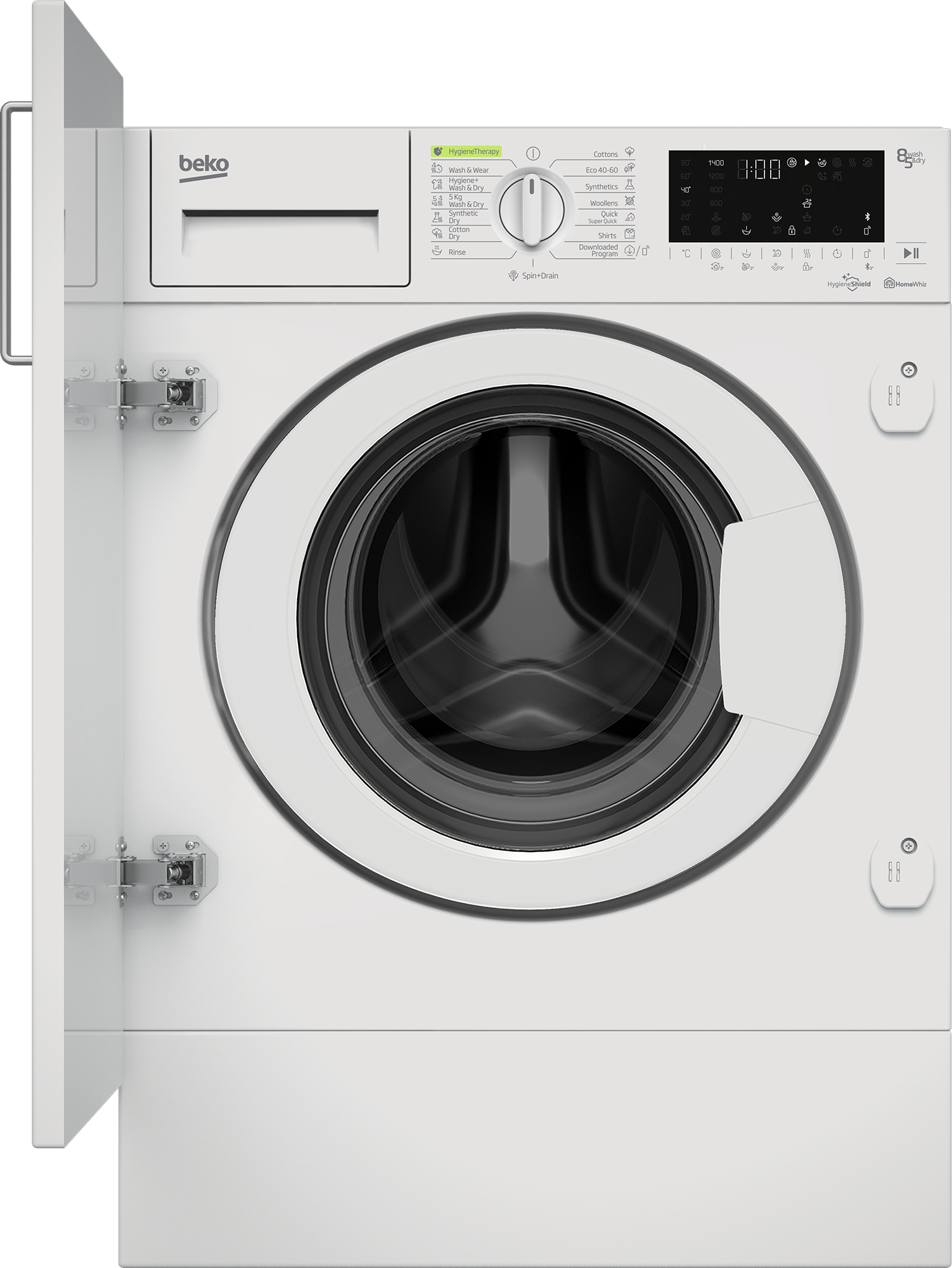 Beko HITV 8736B0 HT: Lavasciuga da Incasso, 8/5 Kg, 1400 giri/min. Tipo di carica: Caricamento frontale, Posizionamento dell'apparecchio: Da incasso, Colore del prodotto: Bianco. Capacità di asciugatura: 5 kg, Velocità di centrifuga massima: 1400 Giri/min, Classe di efficienza della centrifuga: B. Classe di efficienza energetica (lavaggio): C, Classe di efficienza energetica( lavaggio e asciugatura): D, Consumo di acqua (lavaggio): 40 L. Tecnologie Beko (cura dei vestiti): Blocco bambini, Fast+, SteamCure. Profondità: 550 mm, Larghezza: 600 mm, Altezza: 820 mm