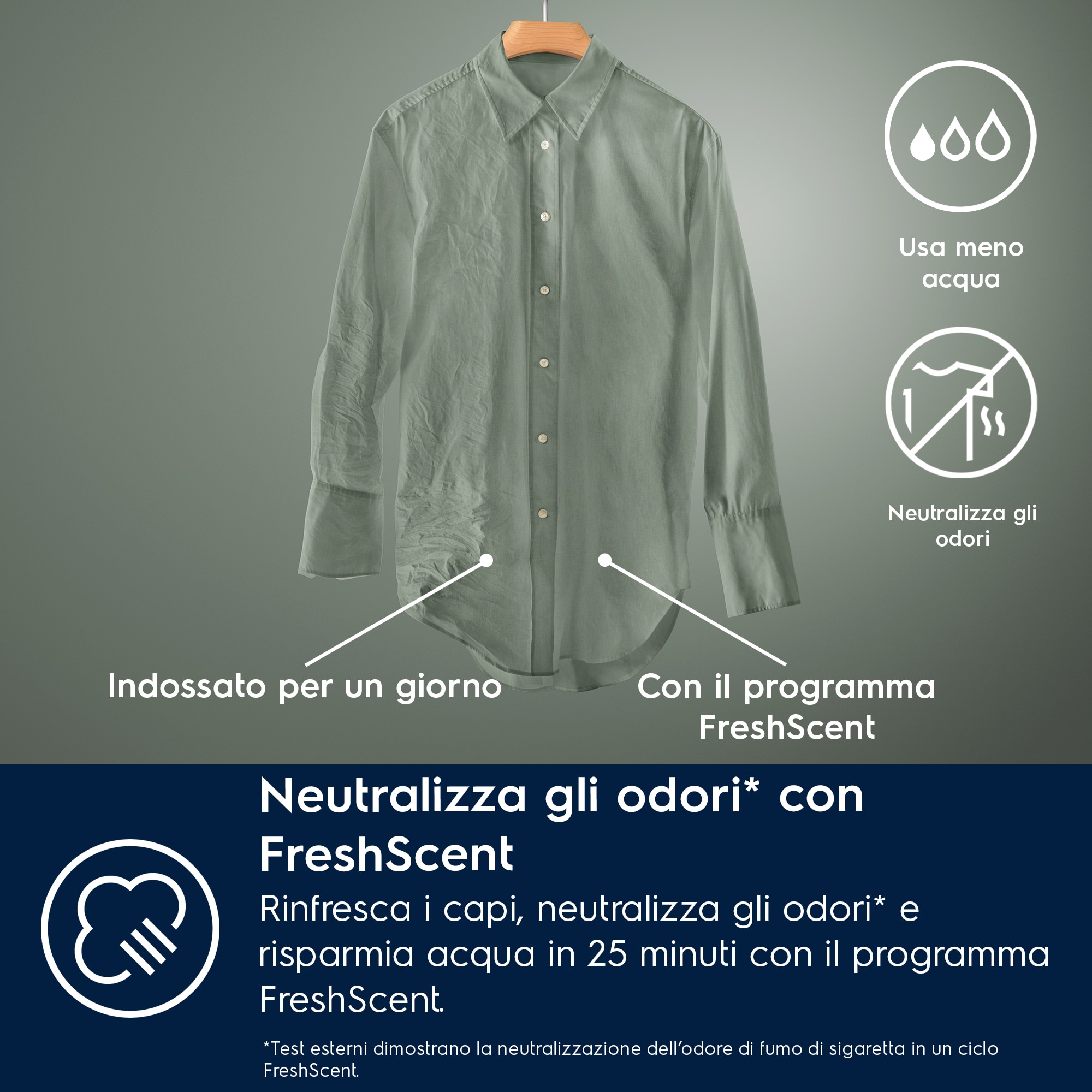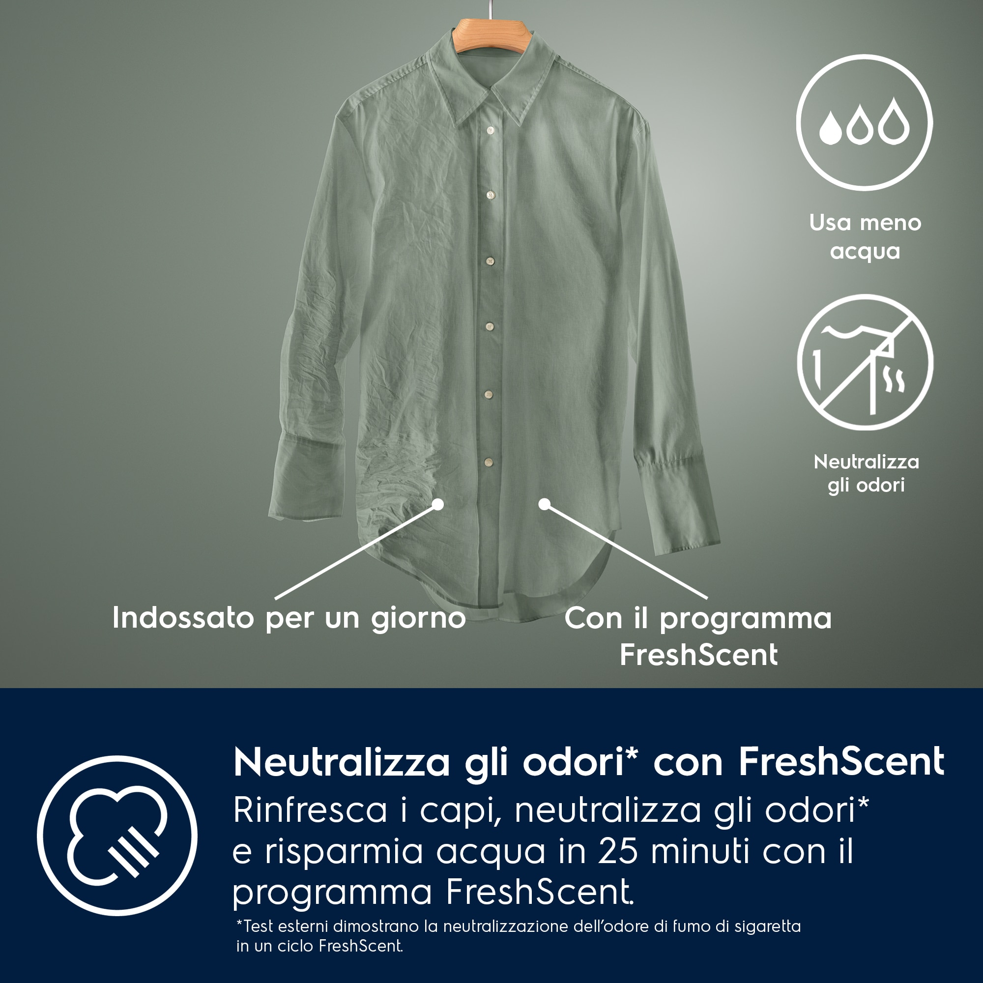 Il piacere di indossare capi che sanno di fresco pulito con un consumo d’acqua notevolmente ridotto. Rinfrescando i tuoi capi con il vapore, puoi neutralizzare gli odori[3] e ridurre le pieghe in 25 minuti. Per una maggiore freschezza, aggiungi la nostra fragranza per vapore al programma FreshScent.