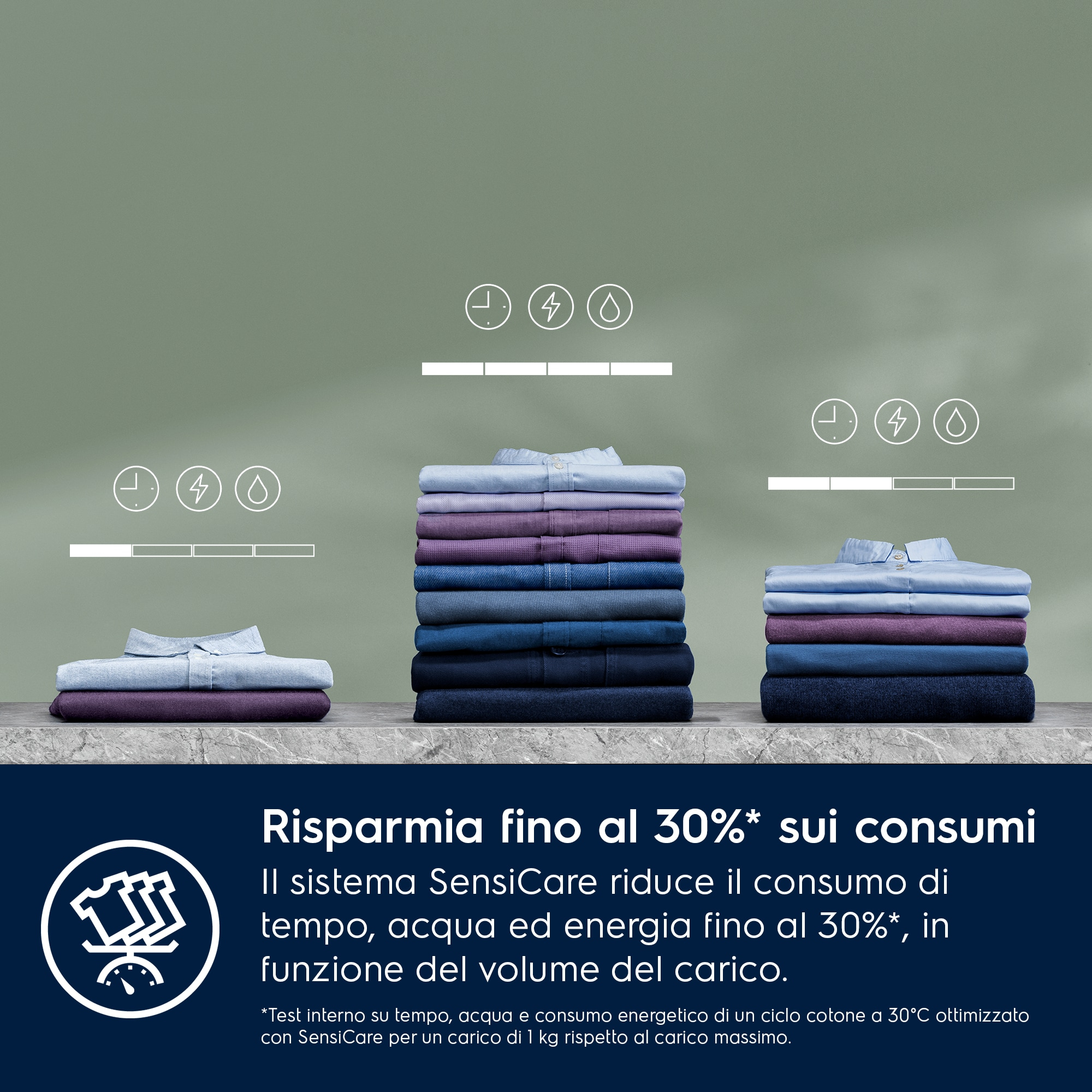 La Tecnologia SensiCare System abbina le impostazioni di ciascun programma alle dimensioni del carico. I sensori intelligenti consentono di ridurre tempo, acqua ed energia fino al 30%[2] per un lavaggio efficiente, senza usurare inutilmente gli indumenti.