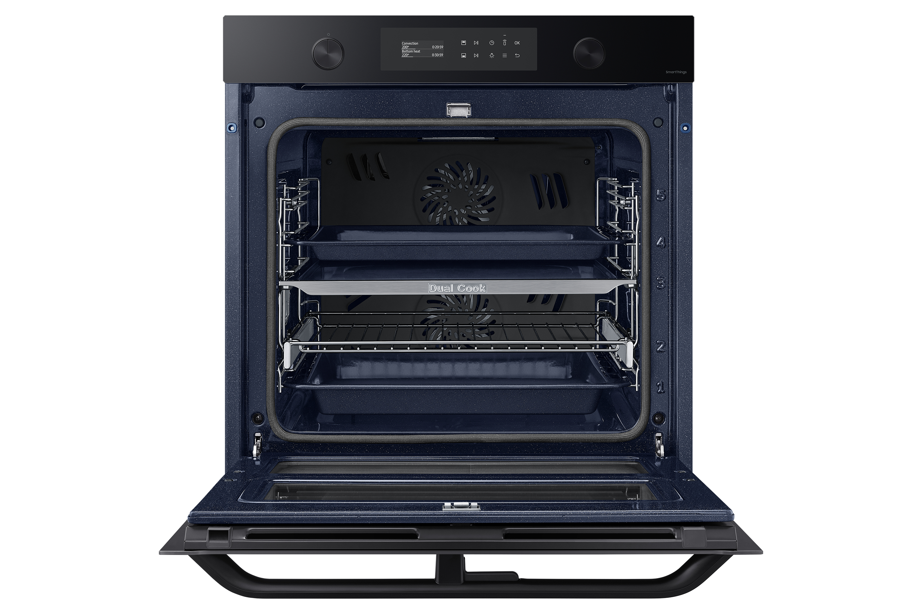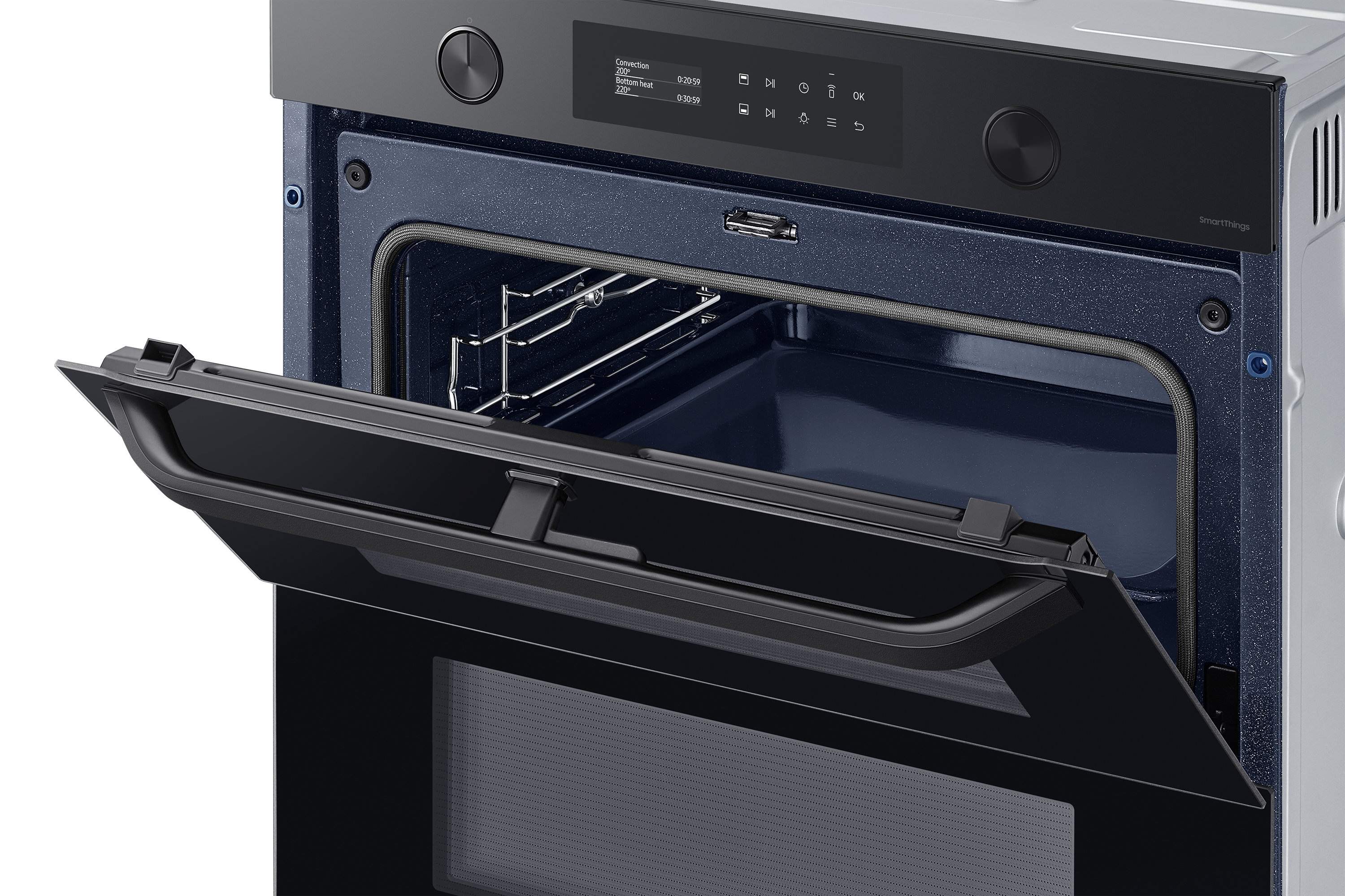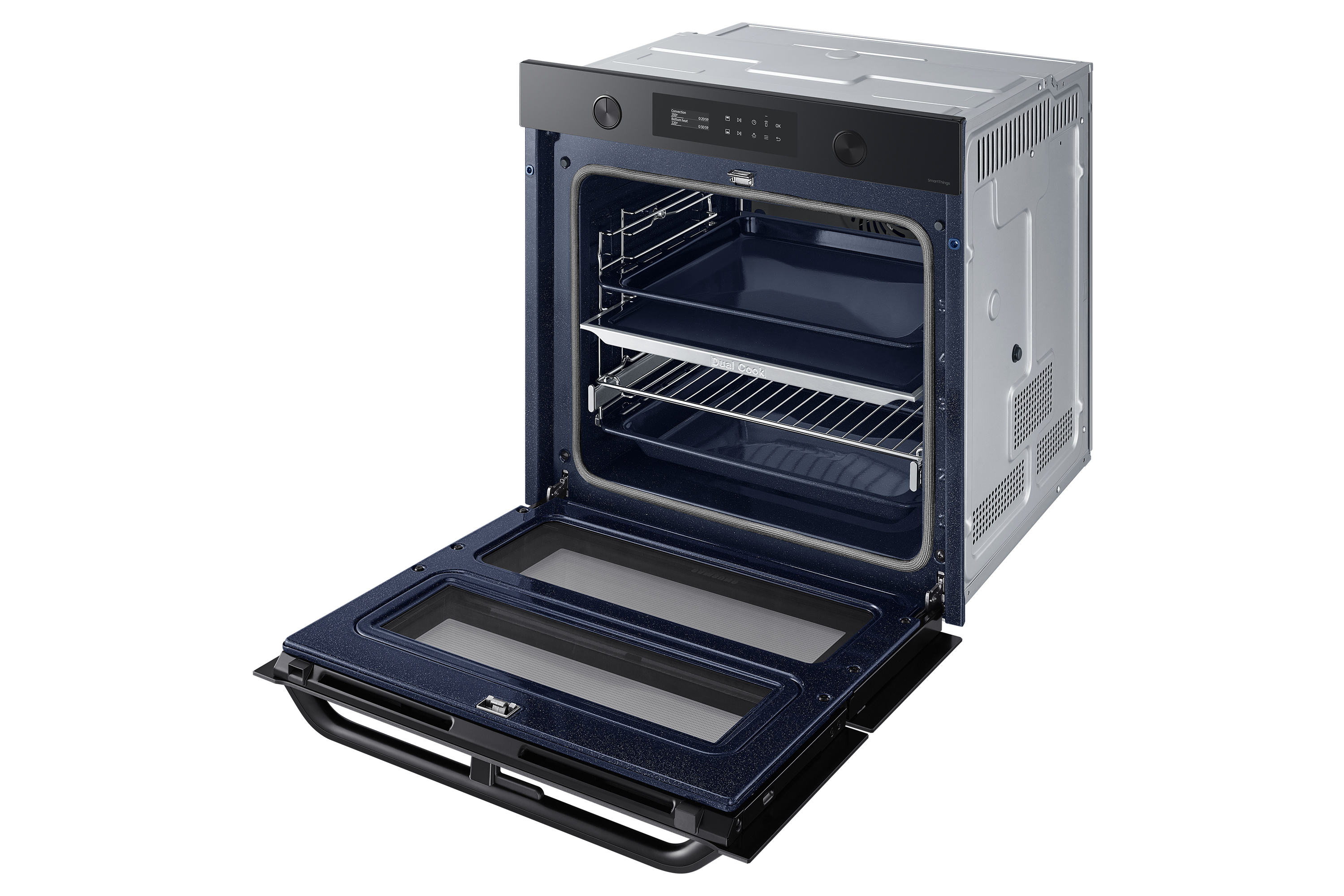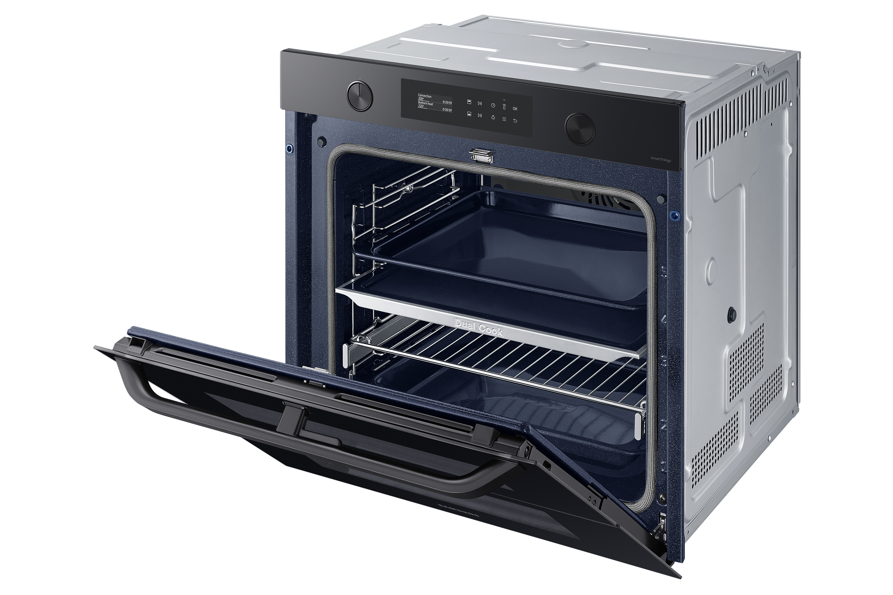 Sfrutta la maggiore versatilità del tuo forno per cucinare in modo più efficiente e dare più sapore ai tuoi piatti. Una porta incernierata e il sistema Dual Cook ti permettono di utilizzare contemporaneamente la zona superiore e quella inferiore con impostazioni diverse. Un display LCD ti consente di cucinare in modo intuitivo. E SmartThings Cooking* rende la tua esperienza in cucina ancora più fluida.