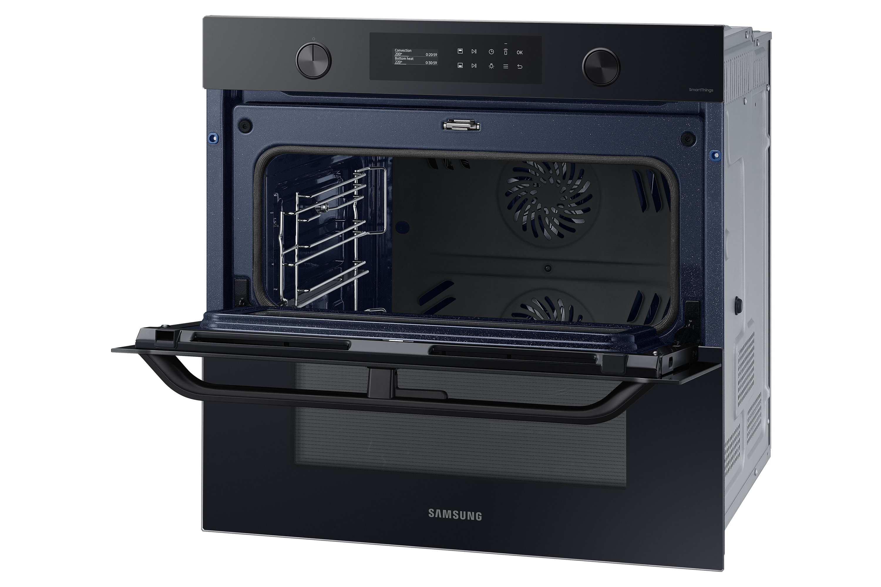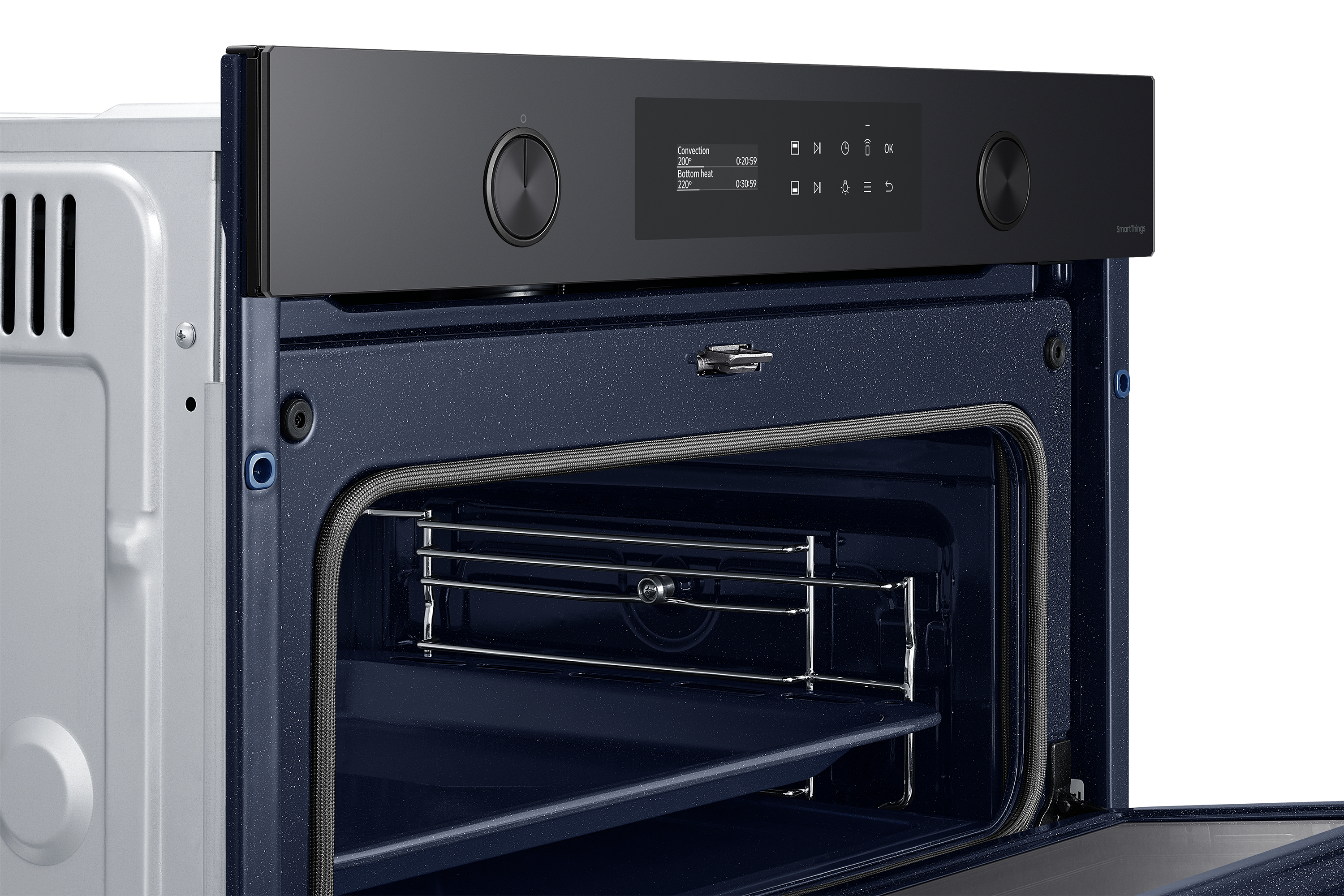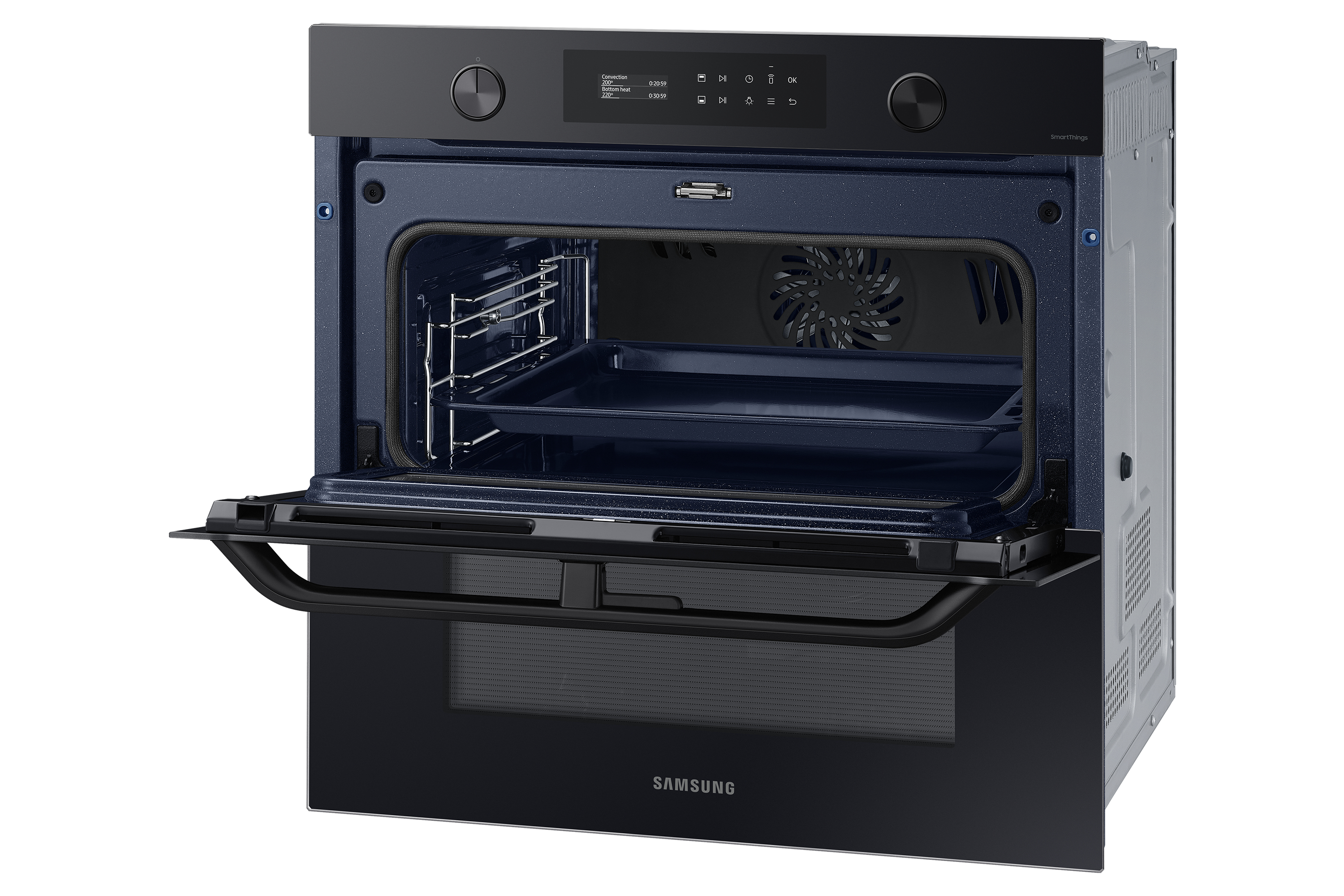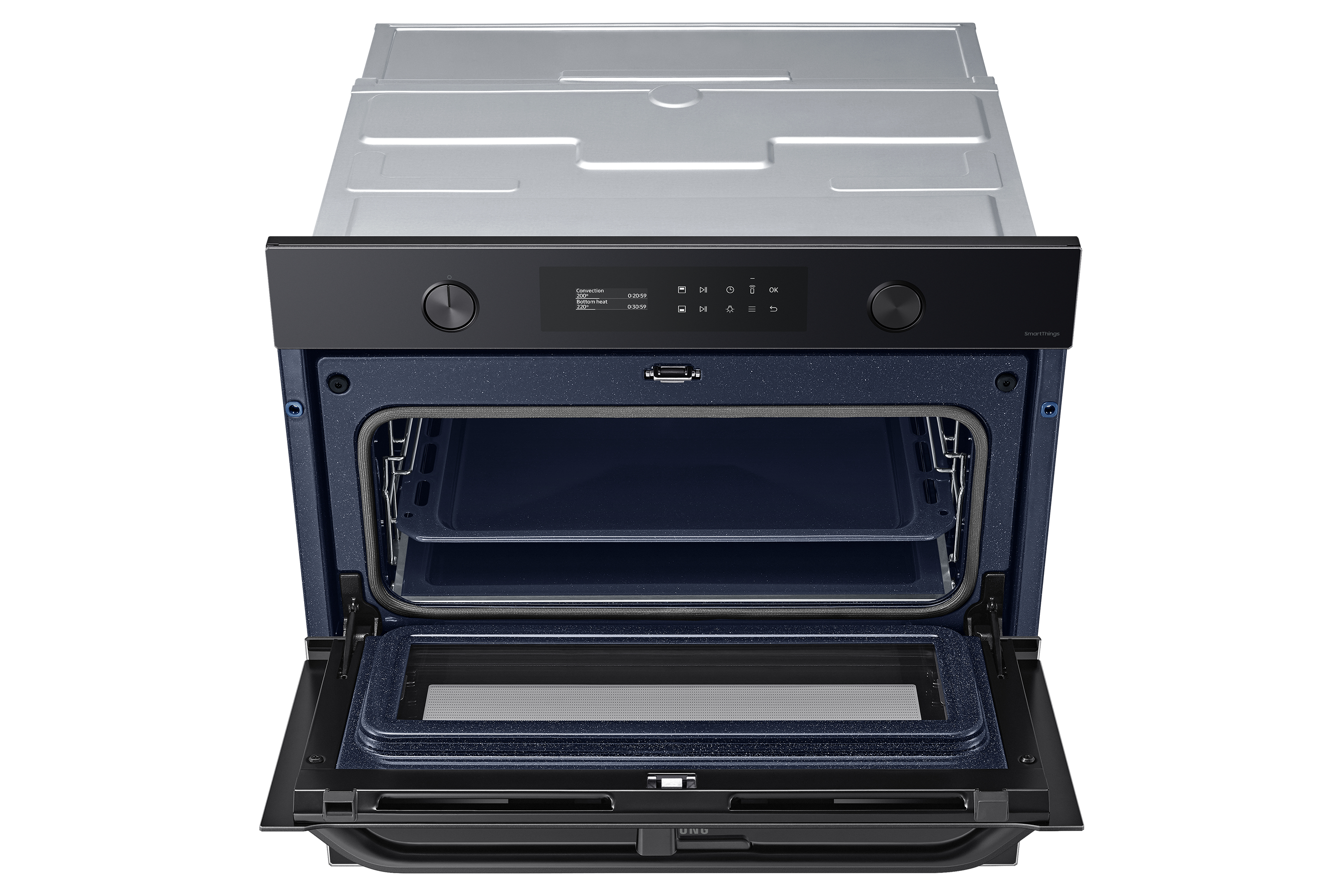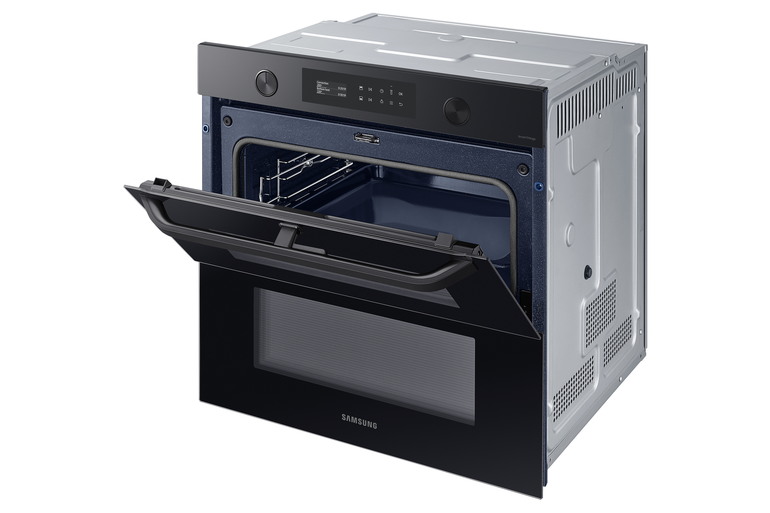 Sfrutta la maggiore versatilità del tuo forno per cucinare in modo più efficiente e dare più sapore ai tuoi piatti. Una porta incernierata e il sistema Dual Cook ti permettono di utilizzare contemporaneamente la zona superiore e quella inferiore con impostazioni diverse. Un display LCD ti consente di cucinare in modo intuitivo. E SmartThings Cooking* rende la tua esperienza in cucina ancora più fluida.