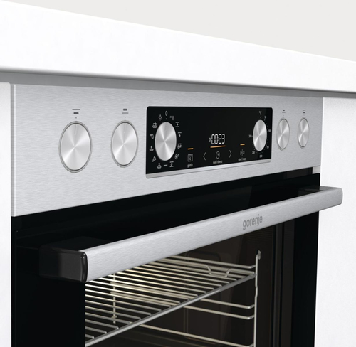 Gorenje BCSI6737E06X. Dimensione del forno: Largo, Tipo di forno: Forno elettrico, Capacità interna forno totale: 77 L. Posizionamento dell'apparecchio: Da incasso, Colore del prodotto: Acciaio inox, Tipo di controllo: Manopola, Touch. Tipo di orologio: Elettronico, Tipo di timer: Digitale, Modalità di impostazione del timer: Timer. Consumo energetico (convenzionale): 0,97 kWh, Consumo energetico (convezione forzata): 0,82 kWh, Scala di efficienza energetica: Da A+++ a D. Tipo di lampada: Alogena