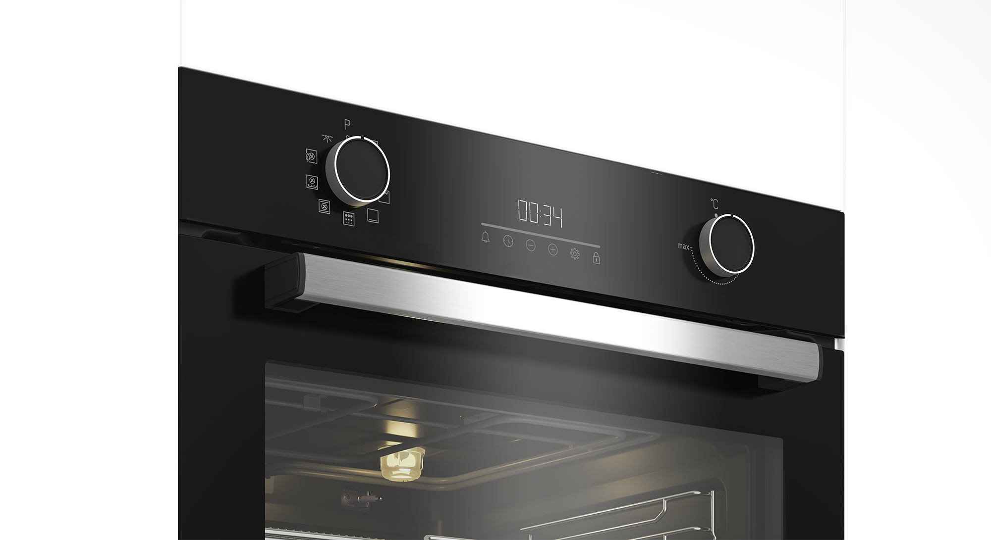 Vuoi sapere come procede la cottura, ma non vuoi aprire la porta del forno per evitare che il calore si disperda? L'Illuminazione Alogena ti offre una visuale completa del forno per tenere d'occhio le tue ricette a porta chiusa.