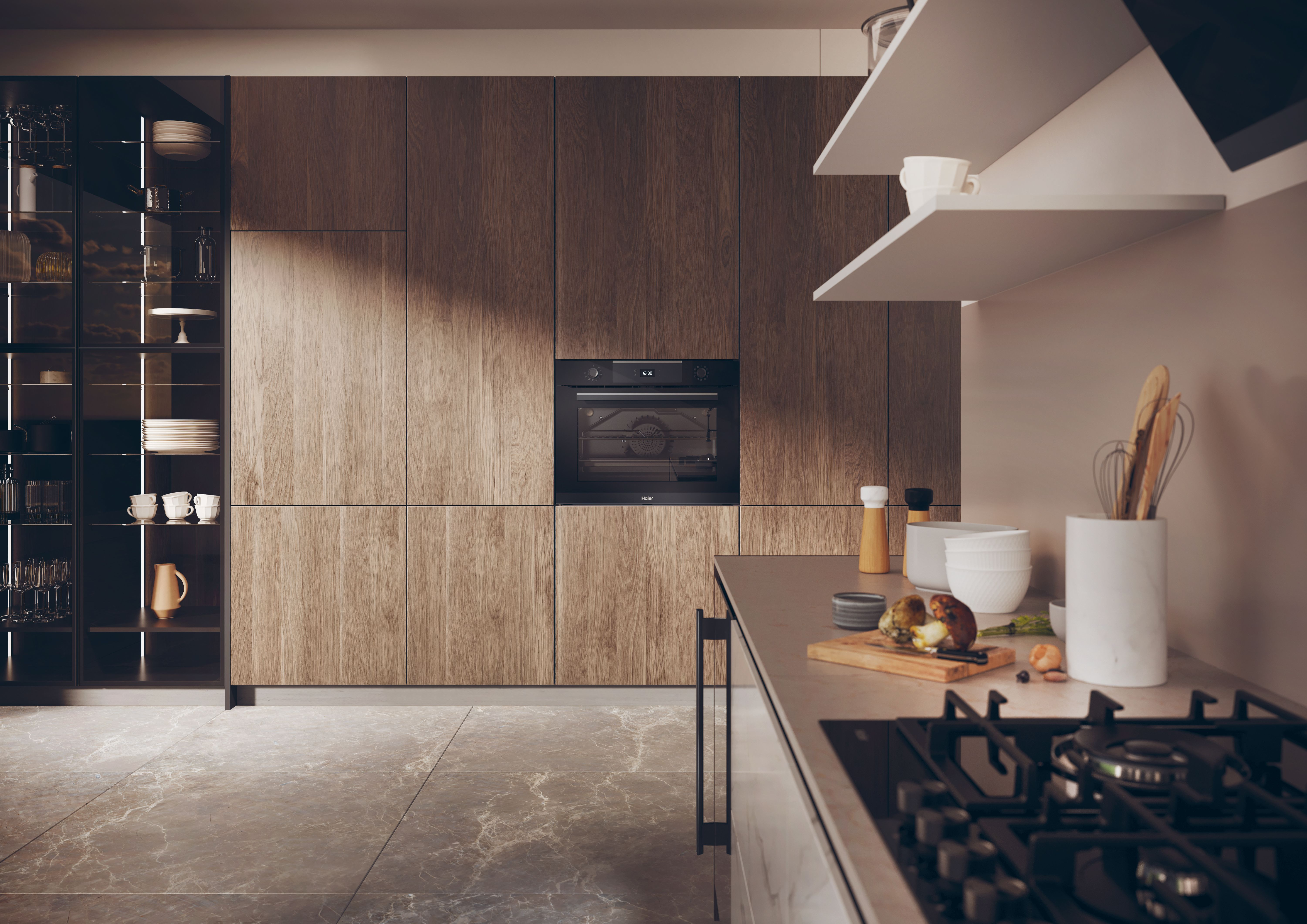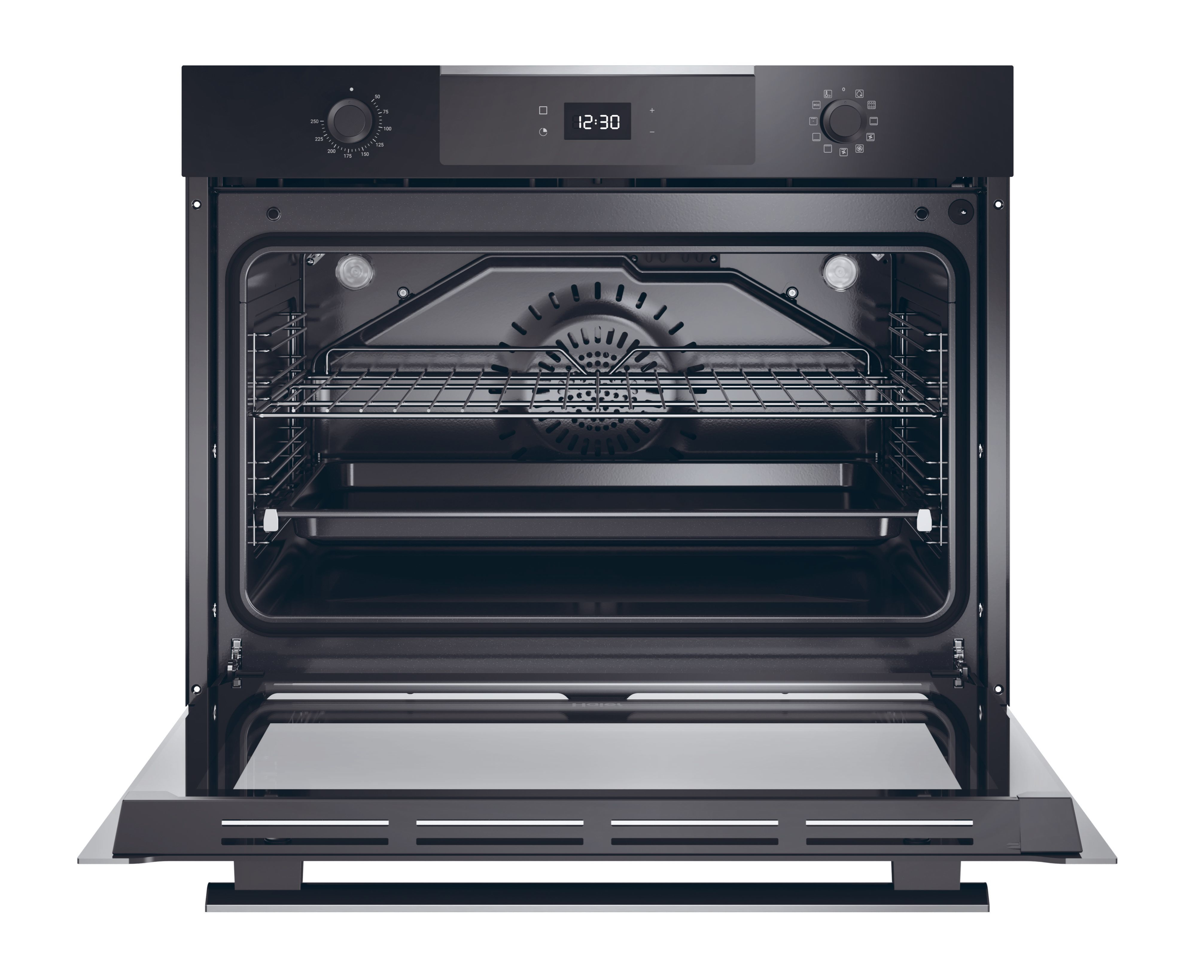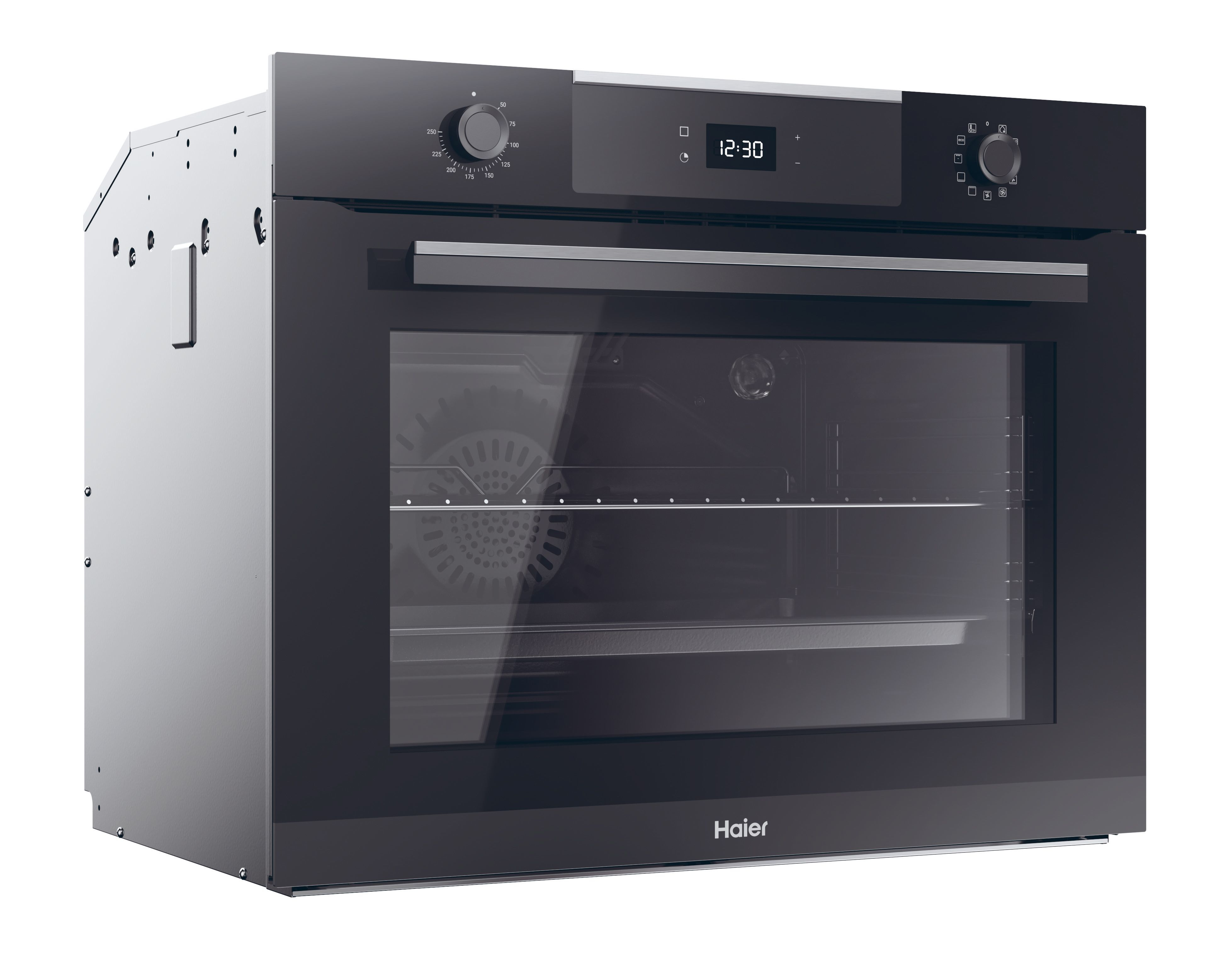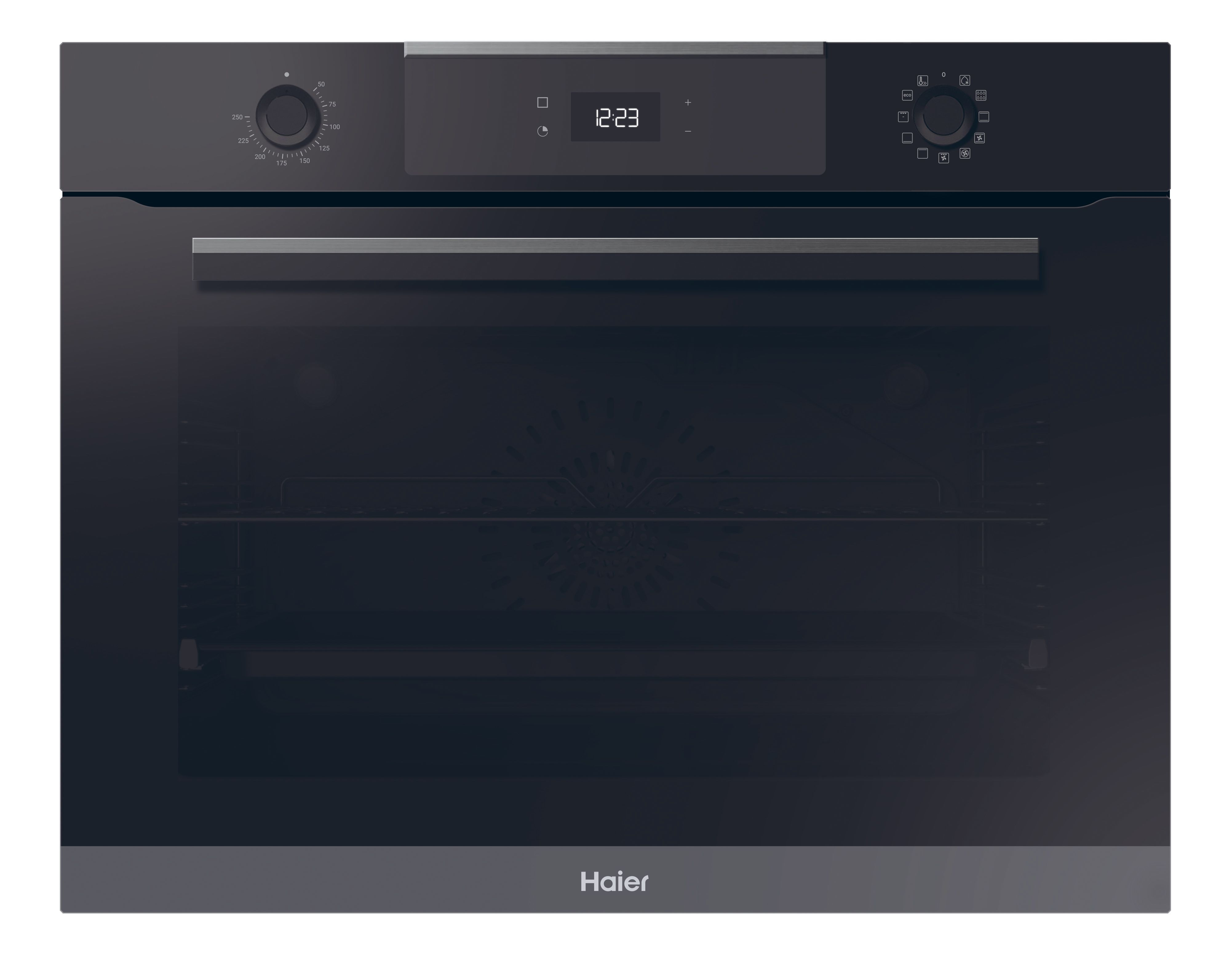 Haier HW075SM6E3B. Dimensione del forno: Largo, Tipo di forno: Forno elettrico, Capacità interna forno totale: 90 L. Posizionamento dell'apparecchio: Da incasso, Colore del prodotto: Nero, Acciaio inox, Tipo di controllo: Manopola, Touch. Tipo di timer: Digitale. Classe efficienza energetica: A, Consumo energetico (convenzionale): 1,2 kWh, Consumo energetico (convezione forzata): 0,87 kWh. Quantità lampade: 2 lampada(e), Tipo di lampada: Alogena
