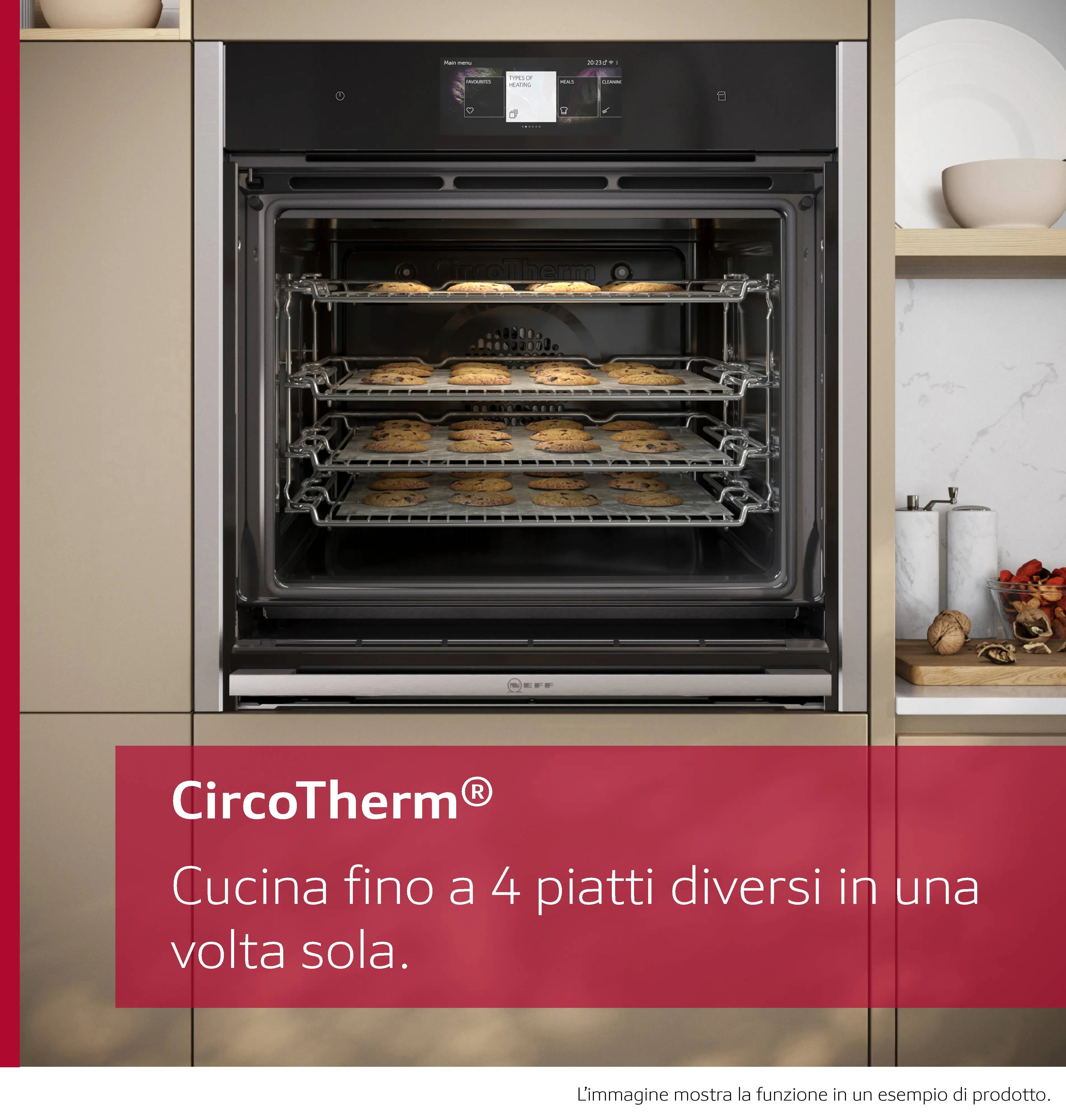 Prepara tutte le portate della tua cena cucinando su 4 livelli contemporaneamente.Con CircoTherm® puoi cucinare fino a 4 pietanze diverse contemporaneamente sui 4 livelli del forno. Il flusso d'aria mirato ad alta velocità assicura che i tuoi piatti si mantengano gustosi e ben separati, senza rischiare che i sapori si mescolino. Per preparare tutte le portate della cena ottimizzando i tempi.
