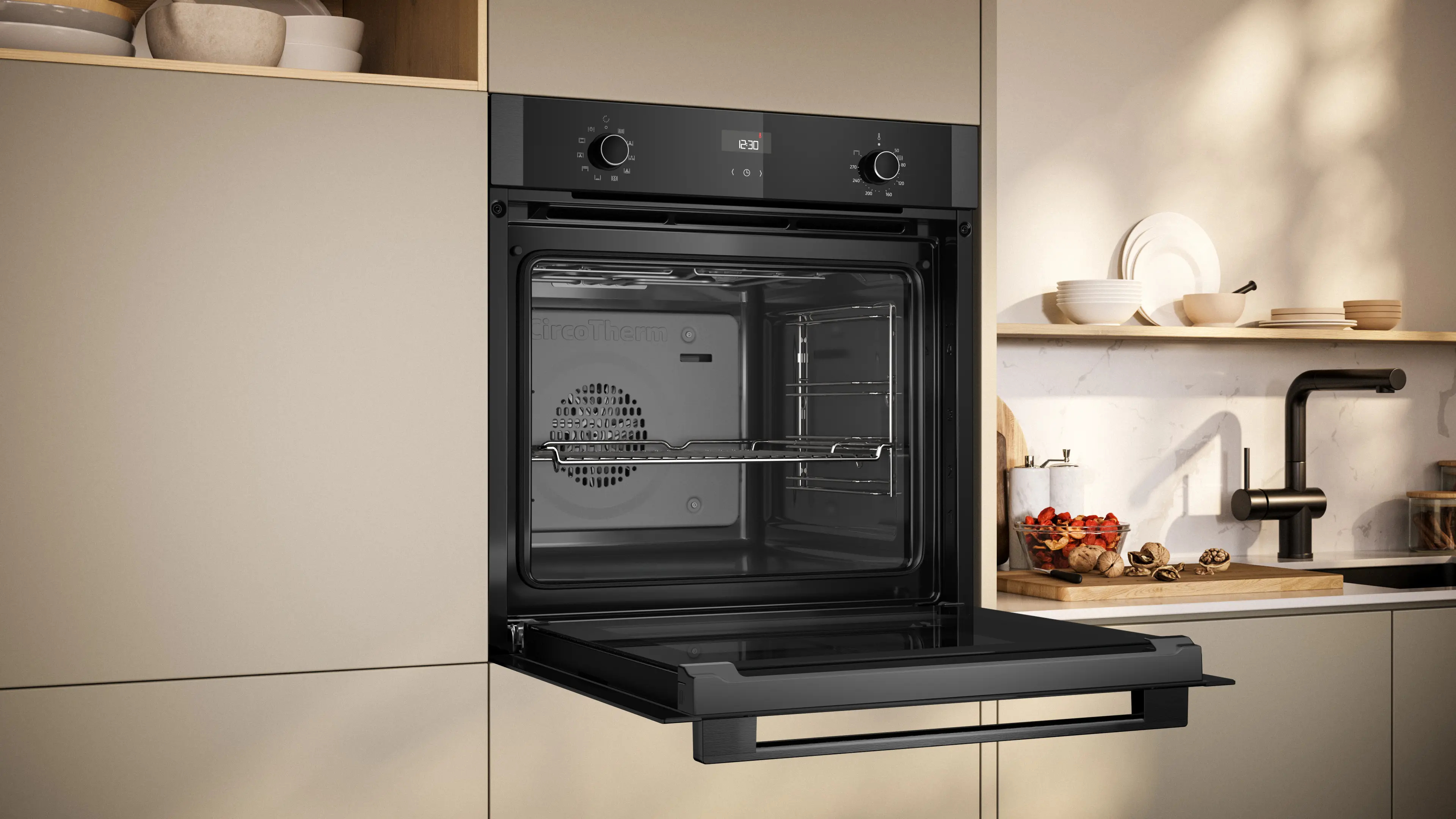 Vuoi cuocere tre teglie di deliziosi biscotti in una volta sola? Adesso puoi farlo, con CircoTherm®. Il flusso d'aria ad alta velocità distribuisce il calore in modo uniforme in tutto il forno. Puoi persino cuocere simultaneamente un magnifico arrosto e la tua torta di frutta preferita. CircoTherm® cuoce ogni piatto con cura, così puoi dedicare più tempo a intrattenere i tuoi ospiti o a pianificare la tua prossima prelibatezza.