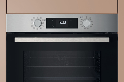 Hotpoint Ariston HAO 278P X. Dimensione del forno: Media, Tipo di forno: Forno elettrico, Capacità interna forno totale: 71 L. Posizionamento dell'apparecchio: Da incasso, Colore del prodotto: Nero, Acciaio inox, Tipo di controllo: Manopola, Touch. Tipo di timer: Digitale. Classe efficienza energetica: A++, Consumo energetico (convenzionale): 0,52 kWh, Consumo energetico (convezione forzata): 0,73 kWh. Quantità lampade: 1 lampada(e), posizione delle illuminazioni: Anteriore sinistra