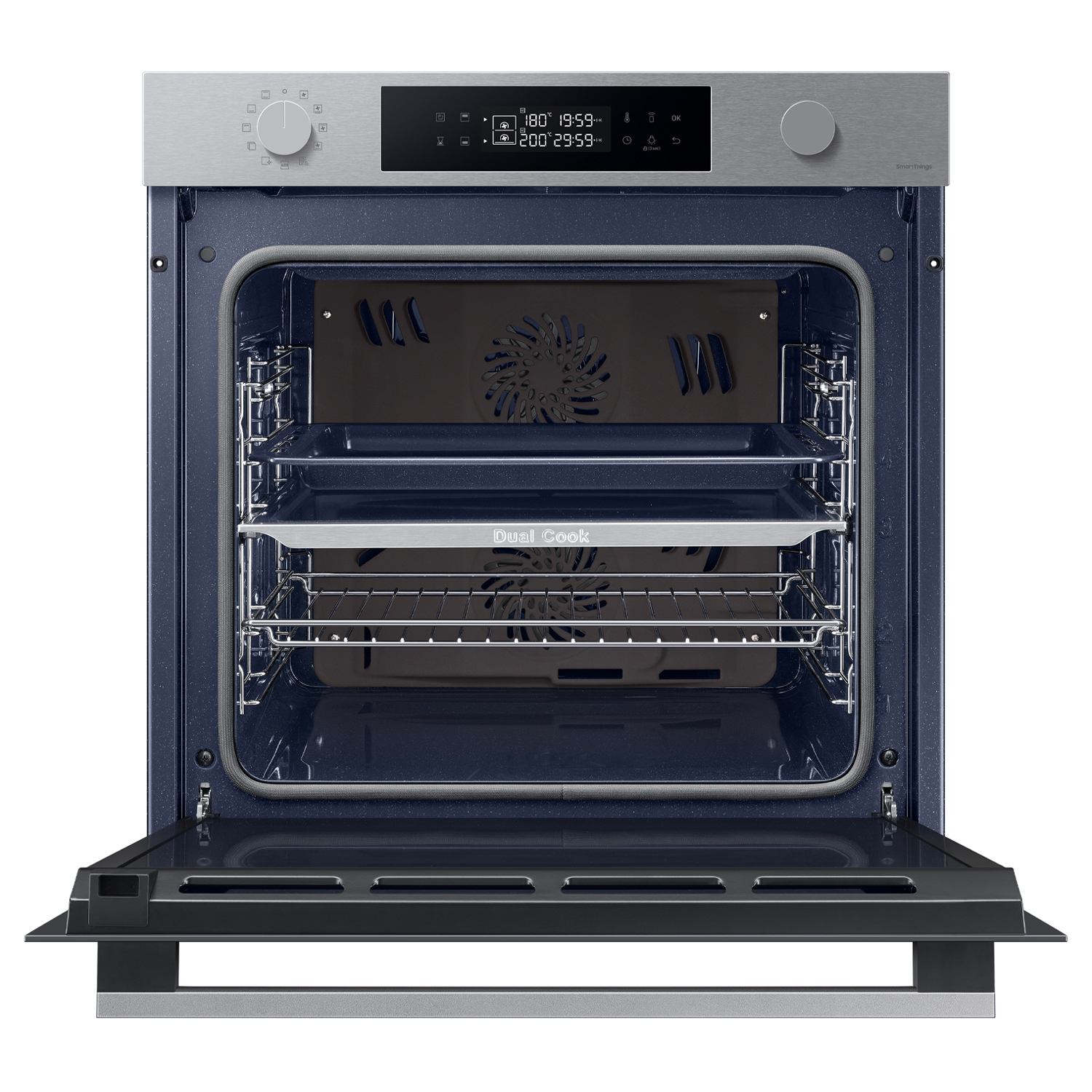 Samsung NV7B44403BS Forno ad incasso Dual Cook Serie 4 76 L A+ Inox. Dimensione del forno: Largo, Tipo di forno: Forno elettrico, Capacità interna forno totale: 76 L. Posizionamento dell'apparecchio: Da incasso, Colore del prodotto: Nero, Acciaio inox, Tipo di controllo: Manopola, Touch. Tipo di orologio: Elettronico, Tipo di timer: Digitale, Modalità di impostazione del timer: Tempo di fine cottura, Timer. Classe efficienza energetica: A+, Consumo energetico (convenzionale): 1,05 kWh, Consumo energetico (convezione forzata): 0,71 kWh. Tipo di lampada: Alogena