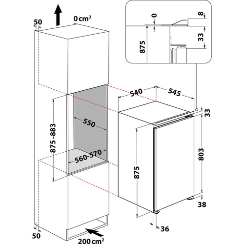 Whirlpool ARG 94312. Posizionamento dell'apparecchio: Da incasso, Colore del prodotto: Bianco, Cerniera porta: Destra. Capacità netta totale: 112 L, Classe emissione rumore: C, Emissione acustica: 38 dB. Capacità netta frigorifero: 96 L, Tipo di lampada: LED. Posizione del congelatore: Posto in alto, Capacità netta congelatore: 16 L, Capacità di congelamento: 2,6 kg/24h. Lunghezza cavo: 2 m