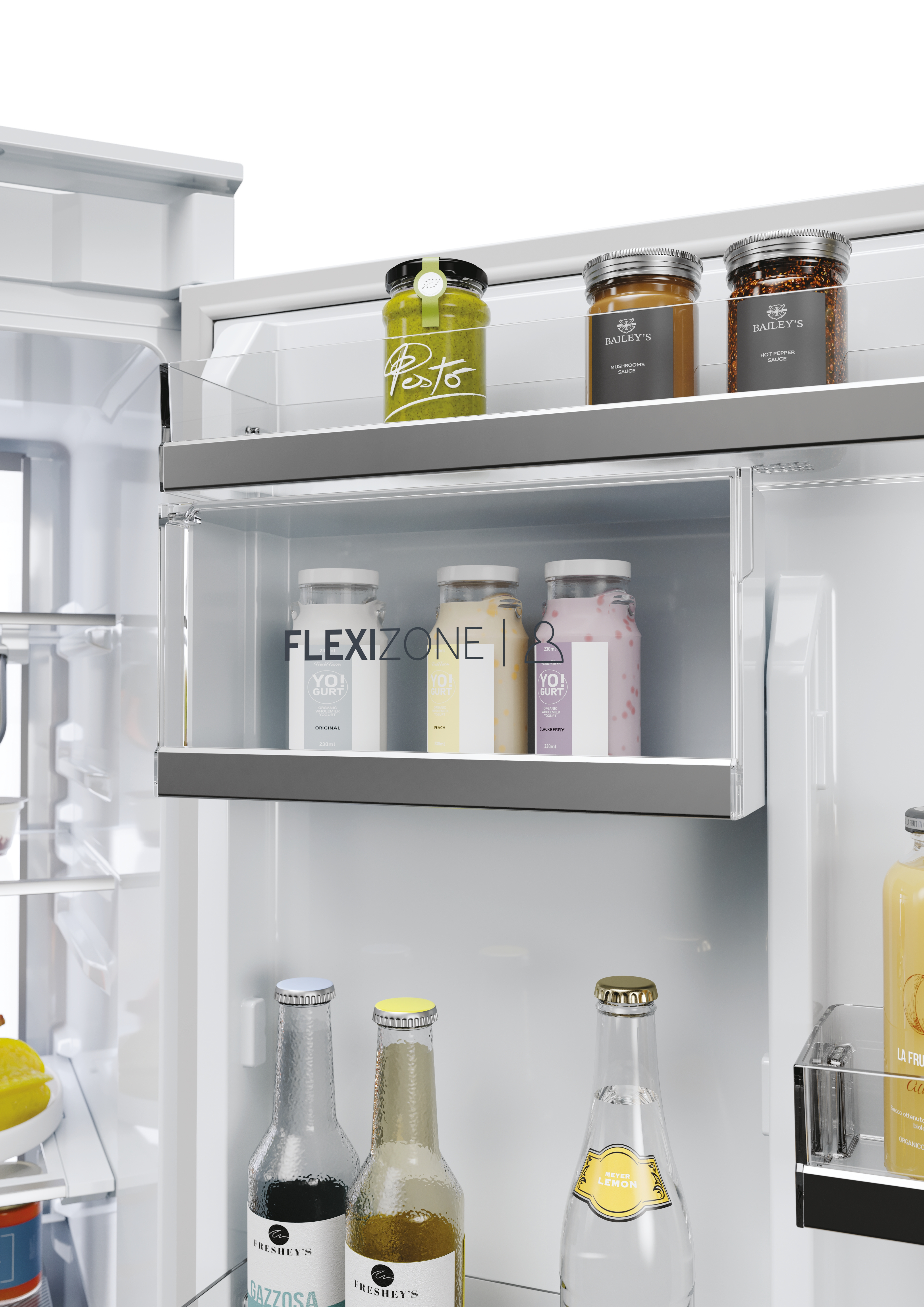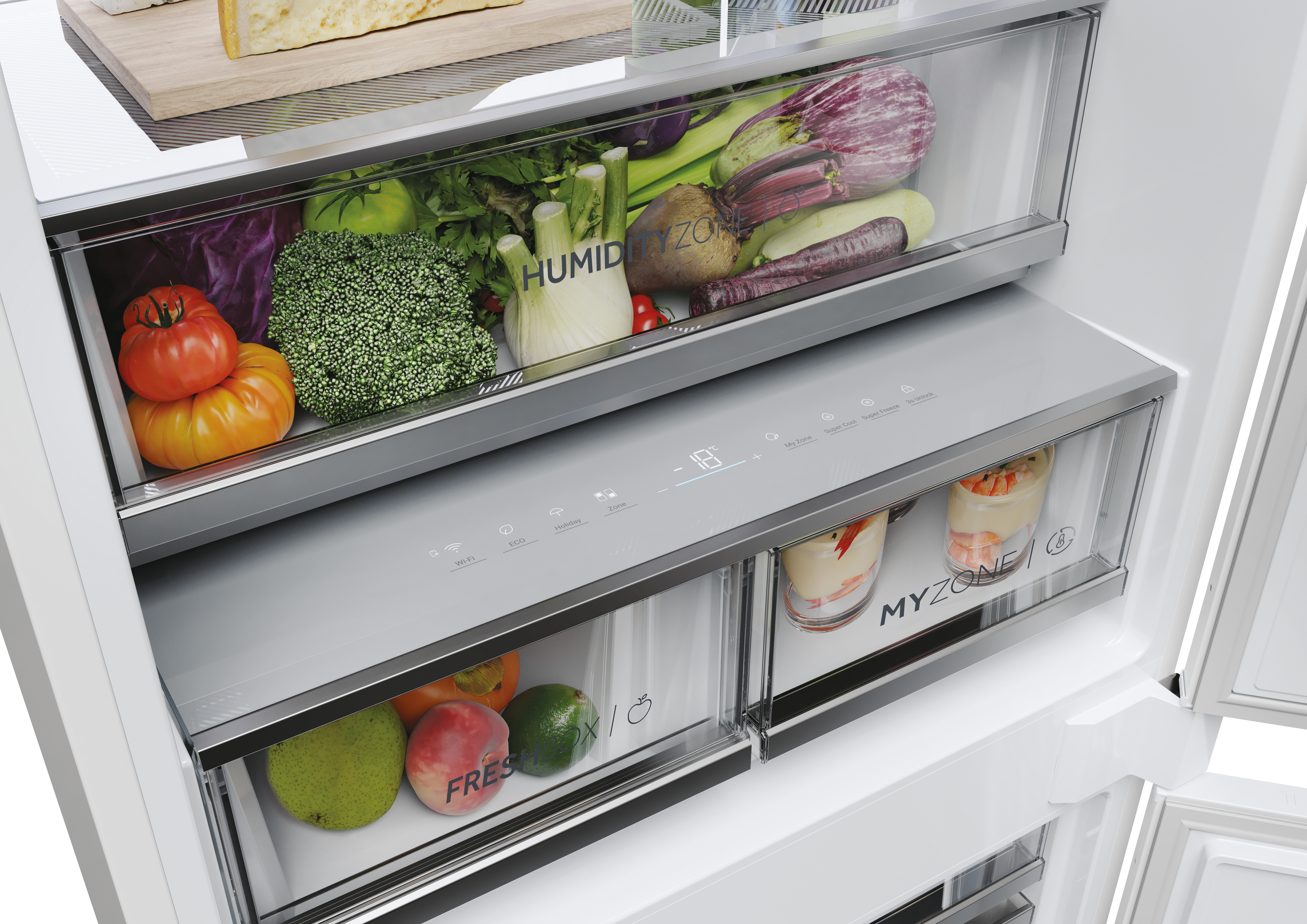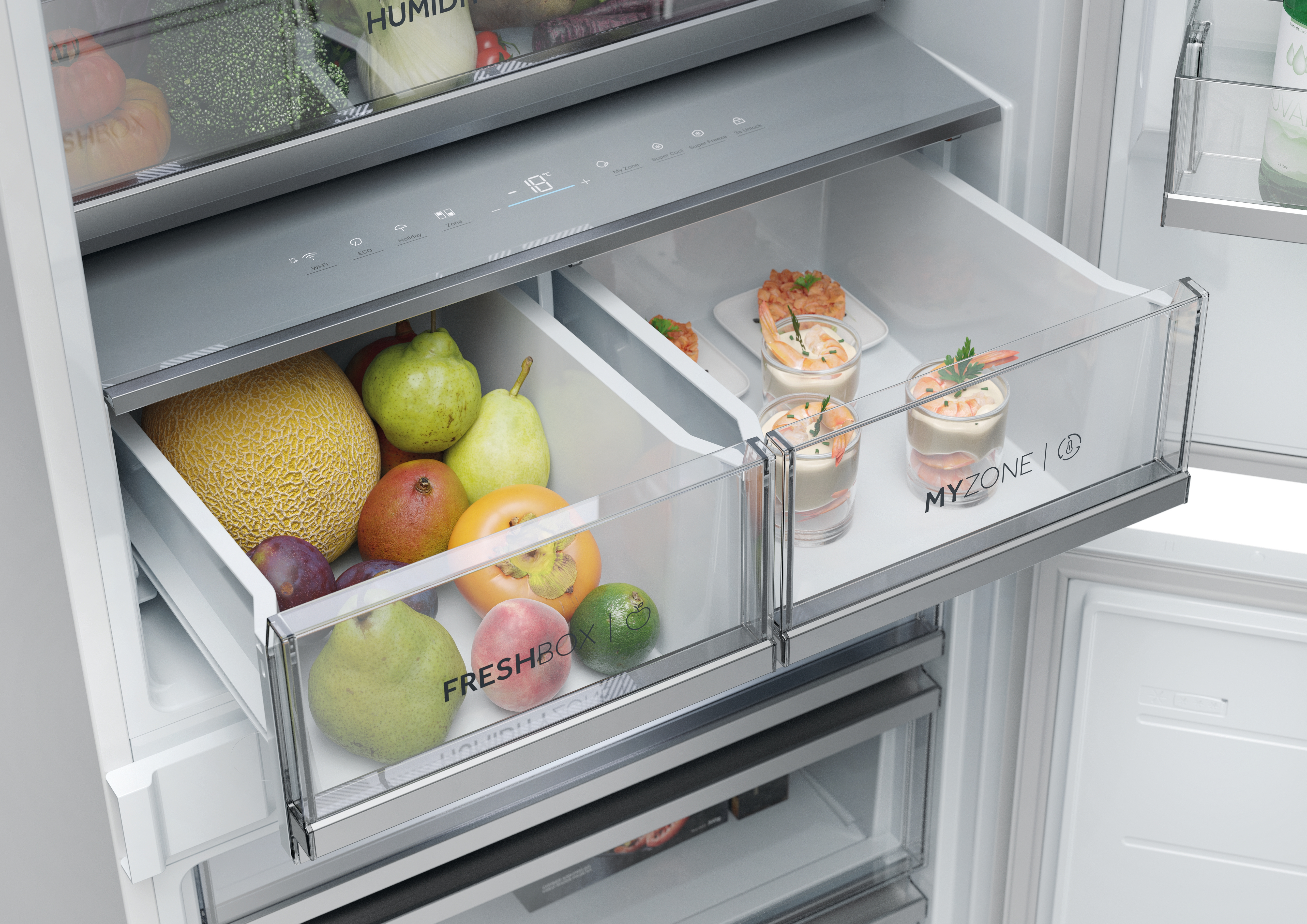 Il nuovo display, posizionato strategicamente al centro dei cassetti, è allo stesso tempo ergonomico e pratico, portando l'esperienza dell'utente a un livello completamente nuovo. Dal display hai il pieno controllo sulle impostazioni della temperatura per ogni scomparto del frigorifero, assicurandoti che il tuo cibo rimanga sempre più fresco. Che tu stia regolando la temperatura per esigenze di conservazione specifiche o gestendo l'innovativa funzionalità My Zone, tutto è a portata di touch. Inoltre, il display ti consente di attivare comode funzioni come la Modalità Vacanza, garantendo efficienza energetica e prestazioni ottimali anche quando sei lontano.