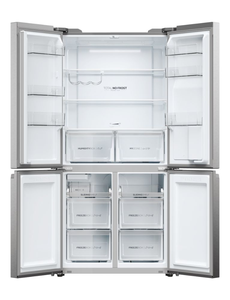 Haier HCR5919EHMP. Capacità netta totale: 525 L. Cerniera porta: Sinistra/destra. Classe climatica: Starfish, Emissione acustica: 38 dB. Capacità netta frigorifero: 351 L, No Frost (frigorifero), Sistema Multi-Airflow (frigorifero), Luce interna. Capacità netta congelatore: 174 L, Capacità di congelamento: 12 kg/24h, No Frost (congelatore). Compartimento zona fresca. Classe efficienza energetica: E, Consumo energetico annuo: 329 kWh. Colore del prodotto: Platino, Acciaio inox
