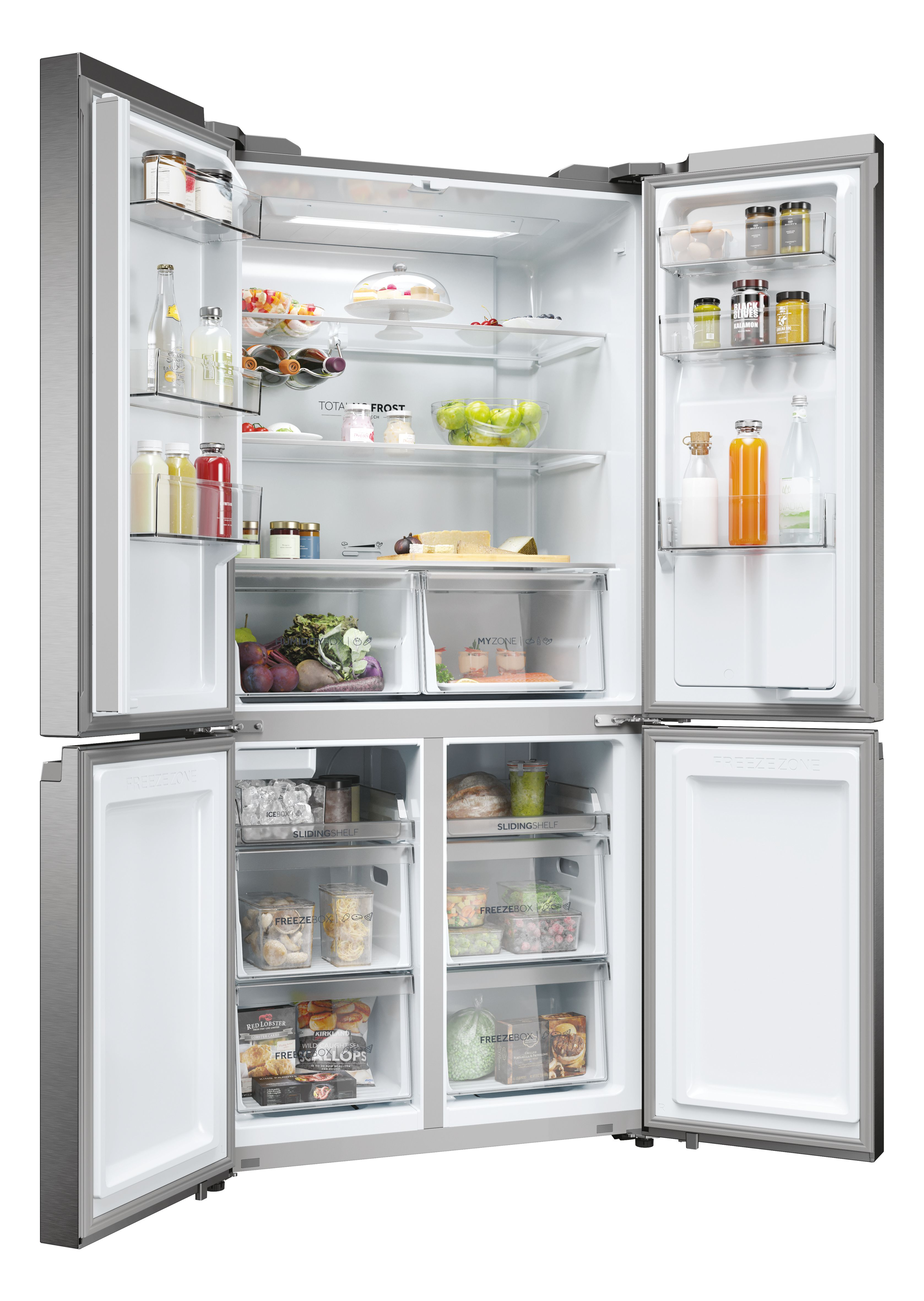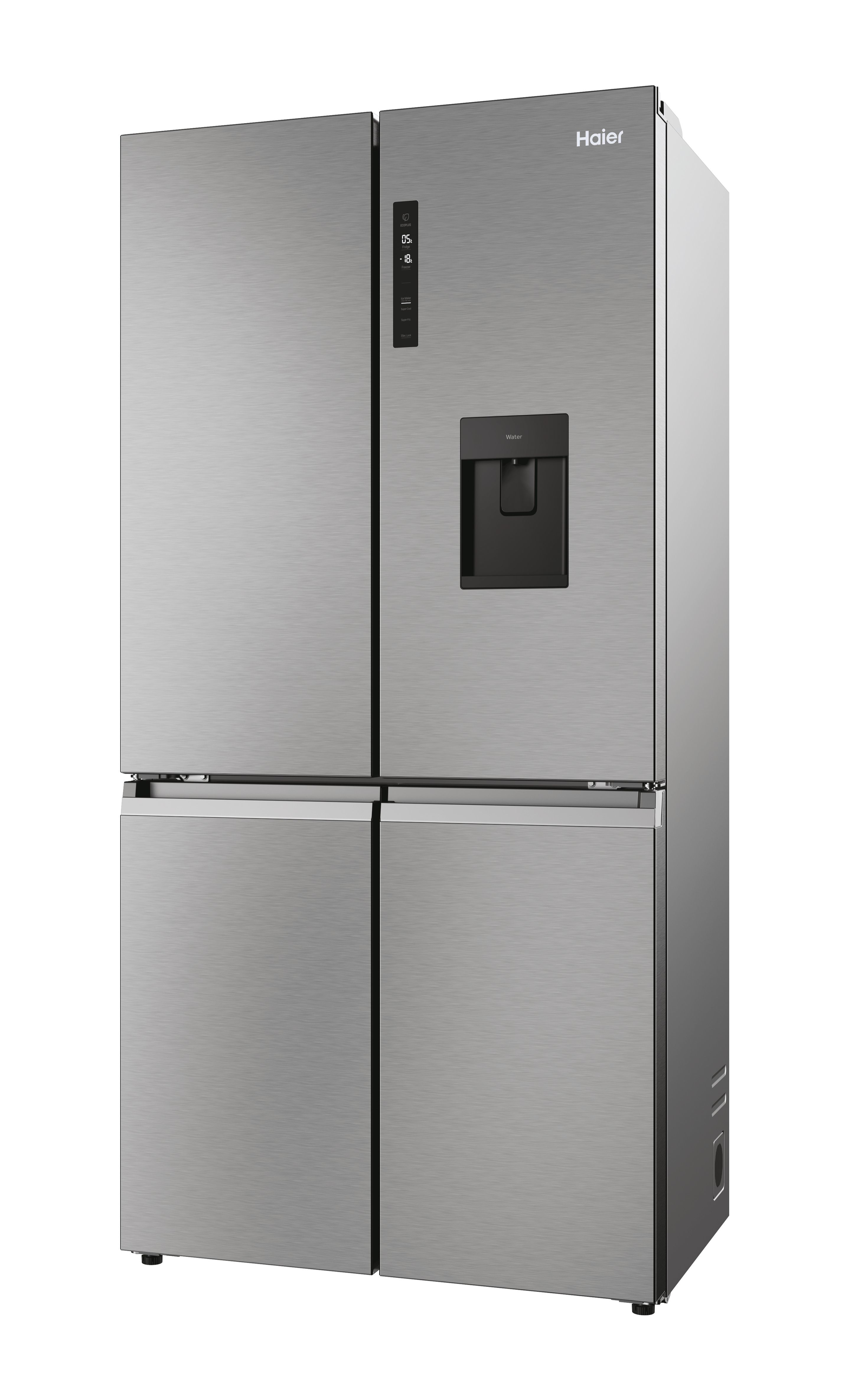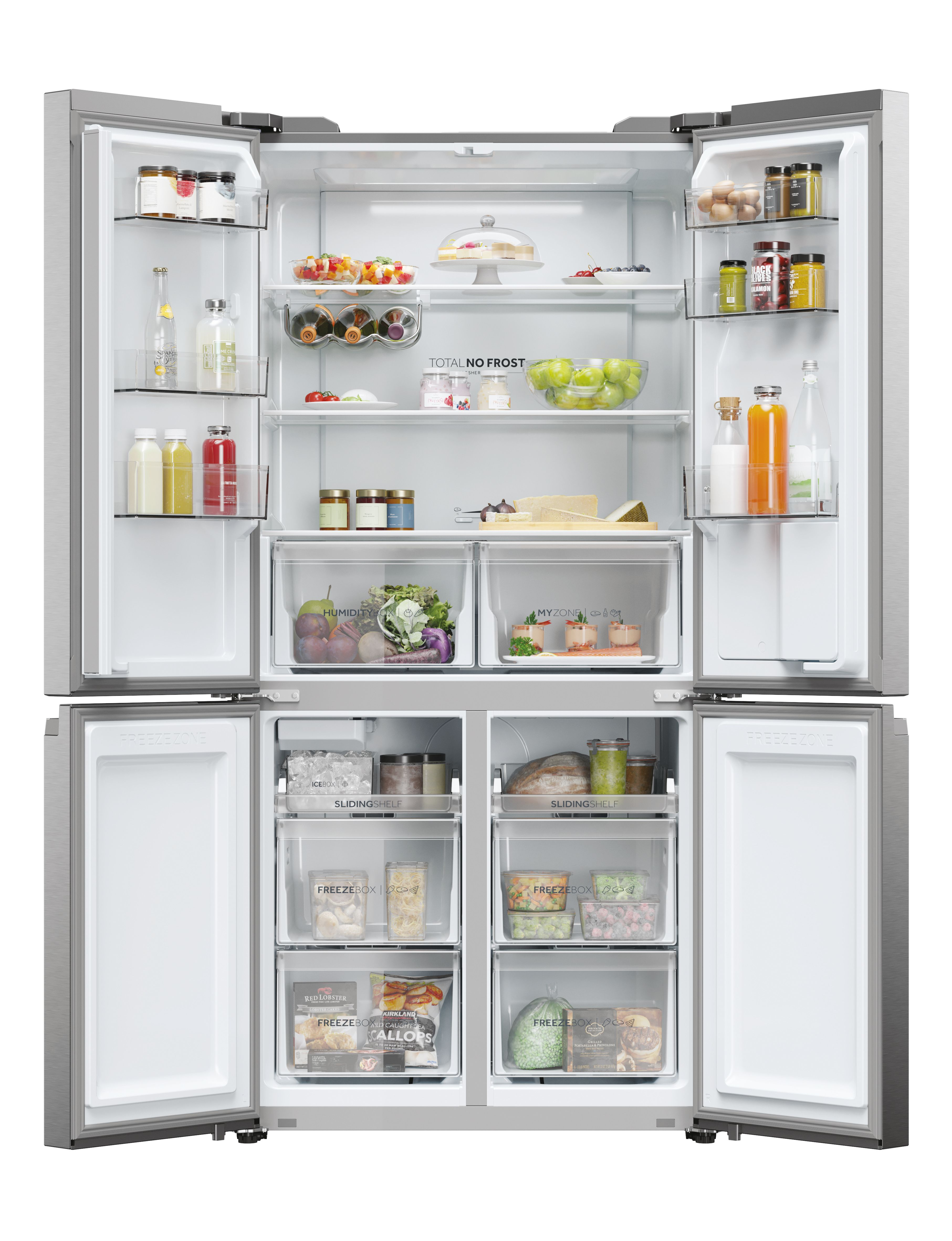 Haier HCR5919EHMP. Capacità netta totale: 525 L. Cerniera porta: Sinistra/destra. Classe climatica: Starfish, Emissione acustica: 38 dB. Capacità netta frigorifero: 351 L, No Frost (frigorifero), Sistema Multi-Airflow (frigorifero), Luce interna. Capacità netta congelatore: 174 L, Capacità di congelamento: 12 kg/24h, No Frost (congelatore). Compartimento zona fresca. Classe efficienza energetica: E, Consumo energetico annuo: 329 kWh. Colore del prodotto: Platino, Acciaio inox