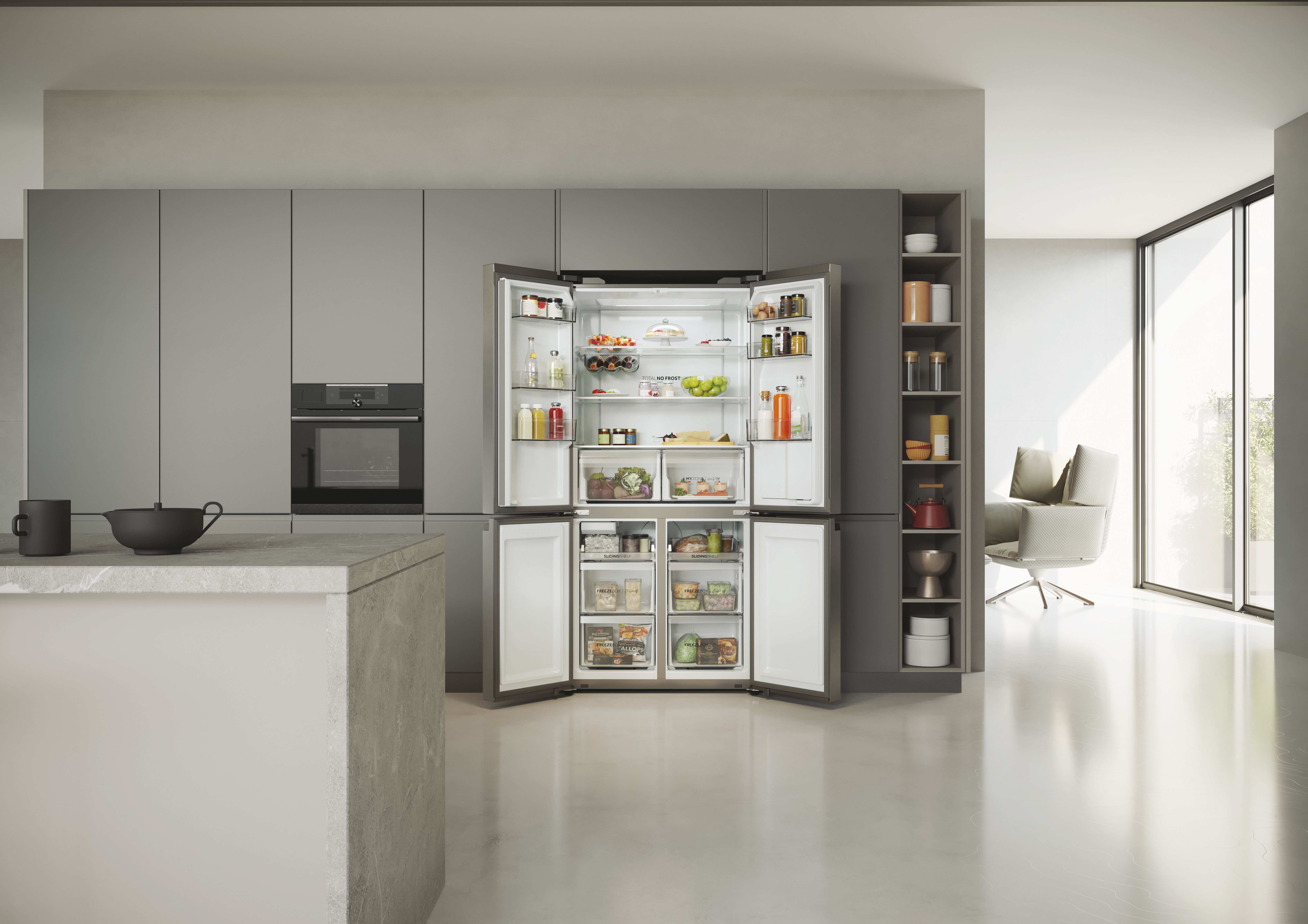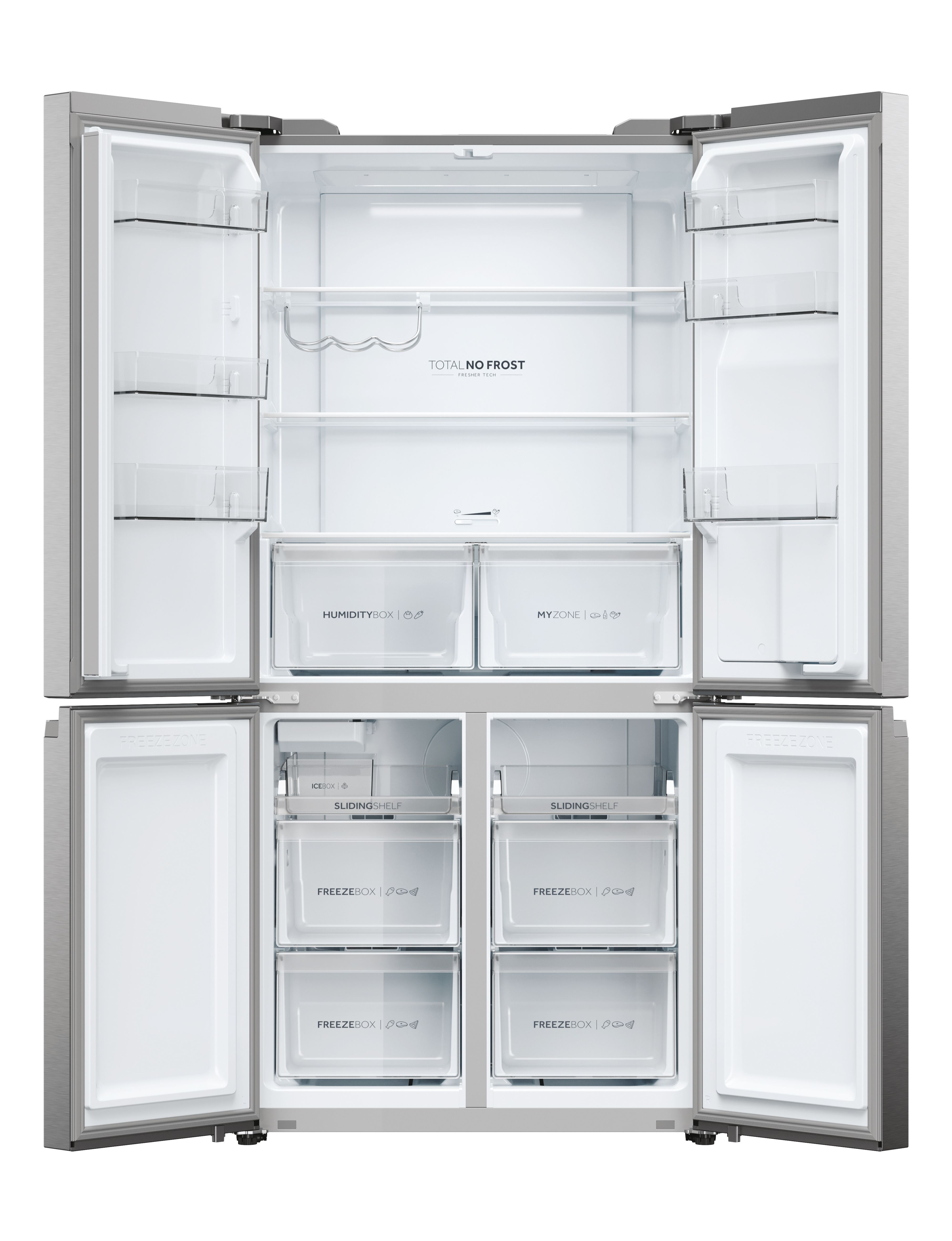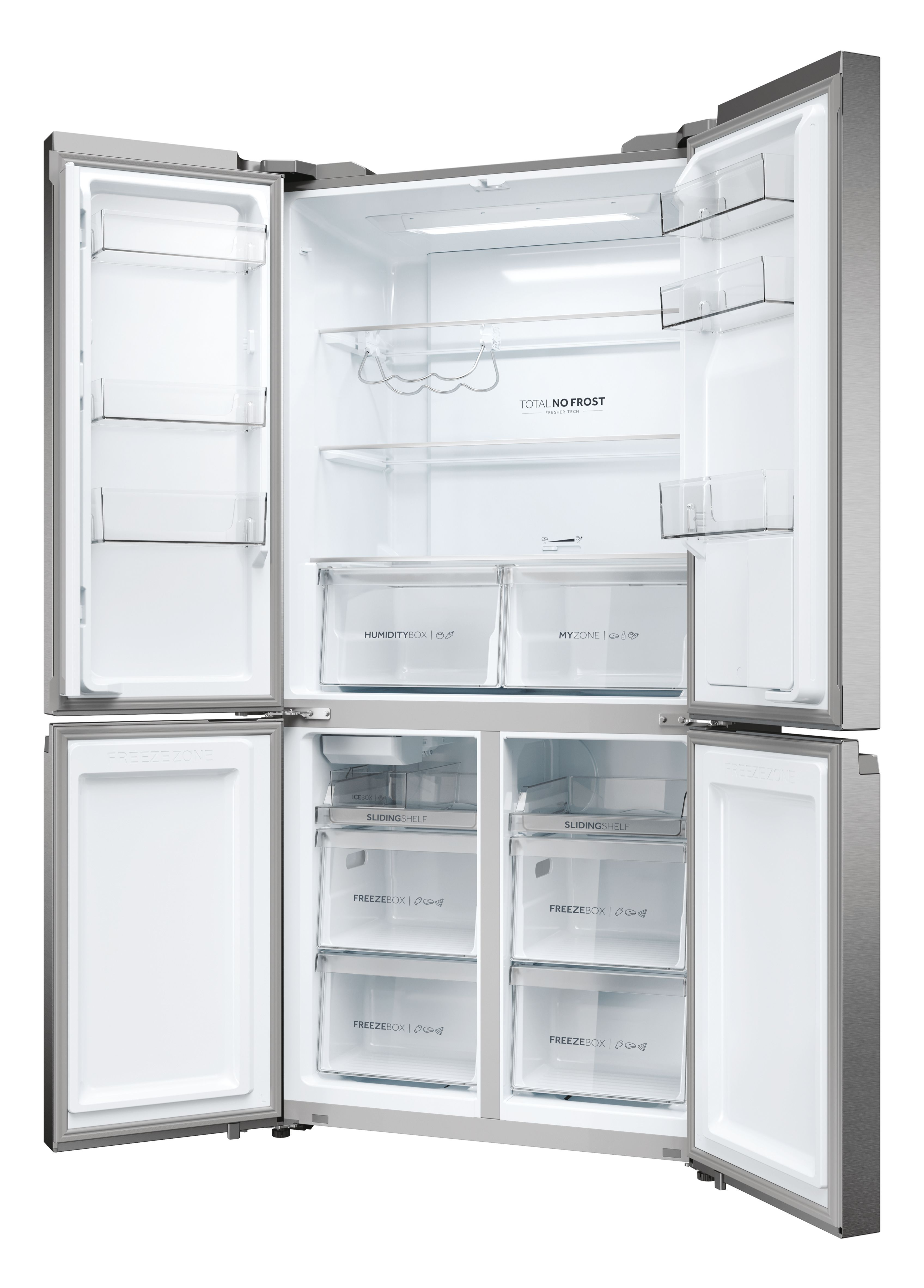 Haier HCR5919EHMP. Capacità netta totale: 525 L. Cerniera porta: Sinistra/destra. Classe climatica: Starfish, Emissione acustica: 38 dB. Capacità netta frigorifero: 351 L, No Frost (frigorifero), Sistema Multi-Airflow (frigorifero), Luce interna. Capacità netta congelatore: 174 L, Capacità di congelamento: 12 kg/24h, No Frost (congelatore). Compartimento zona fresca. Classe efficienza energetica: E, Consumo energetico annuo: 329 kWh. Colore del prodotto: Platino, Acciaio inox