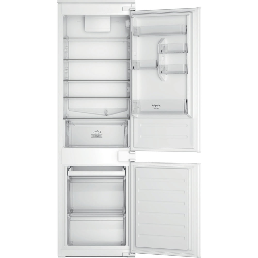 Hotpoint Ariston Frigorifero combinato ad incasso HAC18D011A1. Capacità netta totale: 268 L. Cerniera porta: Destra. Classe climatica: SN-T, Emissione acustica: 34 dB. Capacità netta frigorifero: 189 L, Numero di ripiani frigorifero: 5, Numero di cassetti per verdura: 1. Capacità netta congelatore: 79 L, Capacità di congelamento: 4 kg/24h. Classe efficienza energetica: E, Consumo energetico annuo: 227 kWh. Colore del prodotto: Bianco