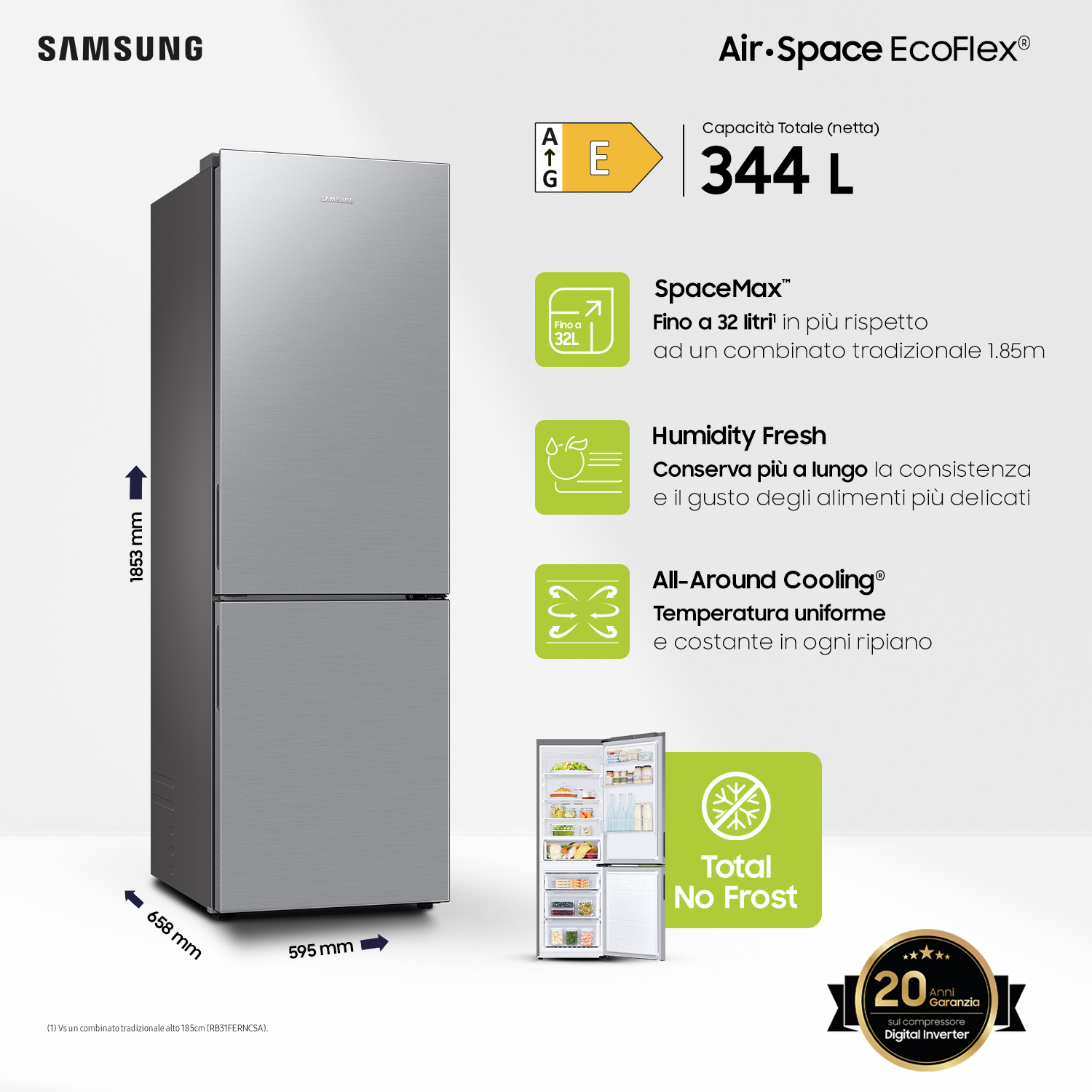 Samsung Frigorifero Combinato EcoFlex 1.85m 344L RB33B610ESA. Capacità netta totale: 344 L. Cerniera porta: Destra. Classe climatica: SN-T, Emissione acustica: 35 dB. Capacità netta frigorifero: 230 L, No Frost (frigorifero), Luce interna, Numero di ripiani frigorifero: 4, Numero di cassetti per verdura: 1. Capacità netta congelatore: 114 L, Capacità di congelamento: 7 kg/24h, No Frost (congelatore). Classe efficienza energetica: E, Consumo energetico annuo: 254 kWh. Colore del prodotto: Grafite, Metallico