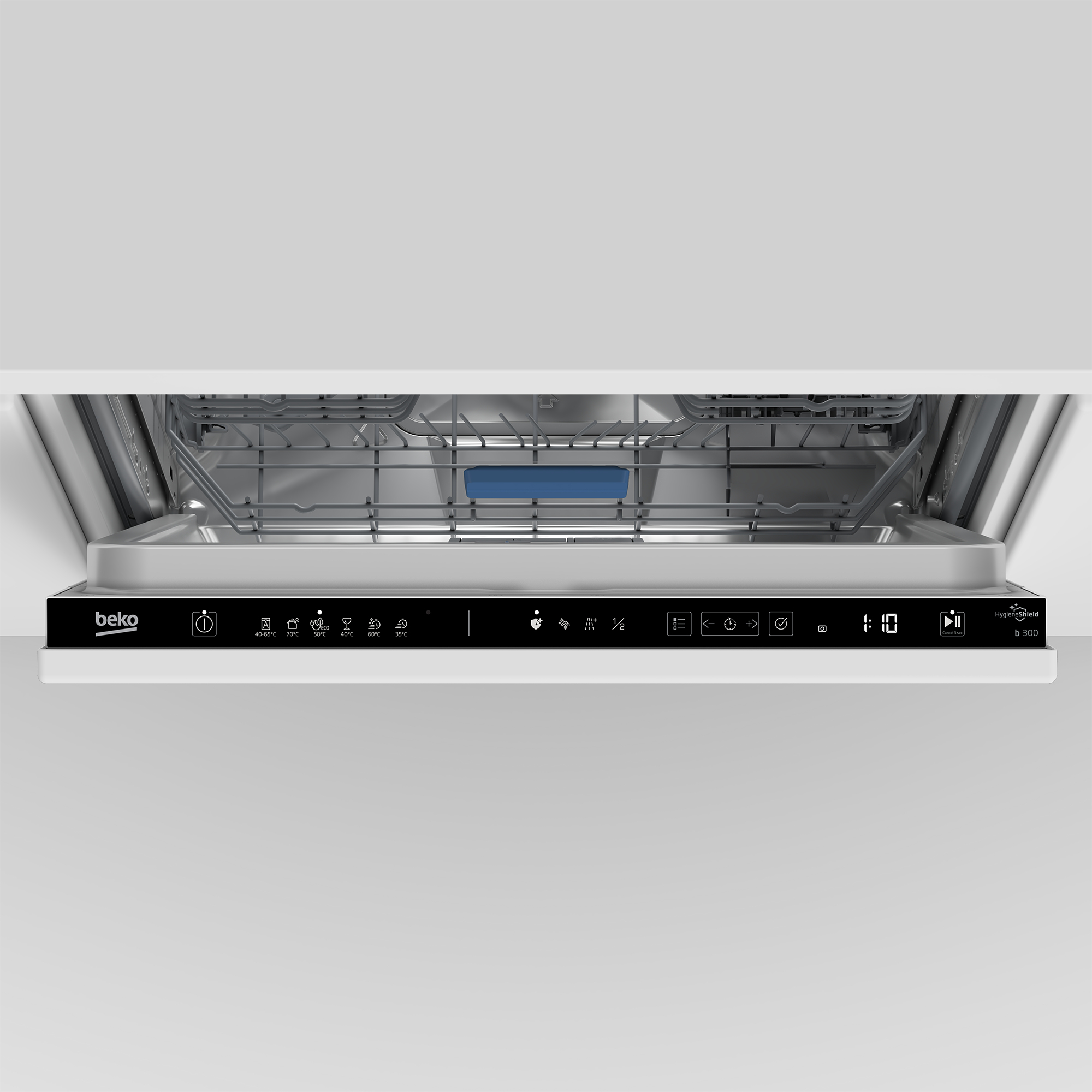 Beko b300 Lavastoviglie a scomparsa totale 60 cm, Classe D, 44dBA, 15 coperti, 6 programmi, Cerniere Sliding. Posizionamento dell'apparecchio: A scomparsa totale, Dimensione: Dimensione massima (60 cm), Colore pannello di controllo: Nero. Numero di coperti: 15 coperti, Classe emissione rumore: B, Emissione acustica: 44 dB. Classe efficienza energetica: D, Consumo di acqua per ciclo: 9,9 L, Consumo energetico per 100 cicli: 86 kWh. Larghezza: 598 mm, Profondità: 550 mm, Altezza: 818 mm. Tecnologie Beko (lavaggio stoviglie): Floor Projected Led Spot, HygieneIntense, Quick & Shine®, SelfDry, SteamGloss®