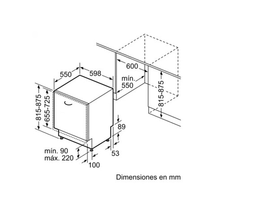 Siemens iQ300 SN63EX15CE. Posizionamento dell'apparecchio: A scomparsa totale, Dimensione: Dimensione massima (60 cm), Colore della porta: Legno. Numero di coperti: 13 coperti, Classe emissione rumore: B, Emissione acustica: 44 dB. Classe efficienza energetica: C, Consumo di acqua per ciclo: 9,5 L, Consumo energetico per 100 cicli: 74 kWh. Larghezza: 598 mm, Profondità: 550 mm, Altezza: 815 mm