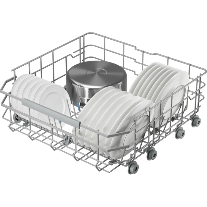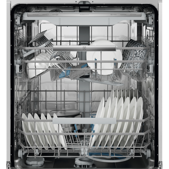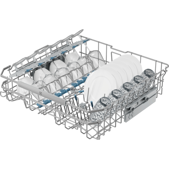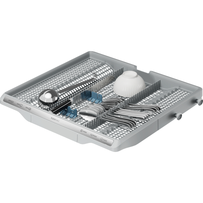 Il cestello FlexiMax Plus ha tre file pieghevoli per la massima flessibilità di carico. I supporti in gomma per calici evitano collisioni e incidenti durante il lavaggio. In mezzo al cestello per posate è presente una sezione più profonda per gli utensili.