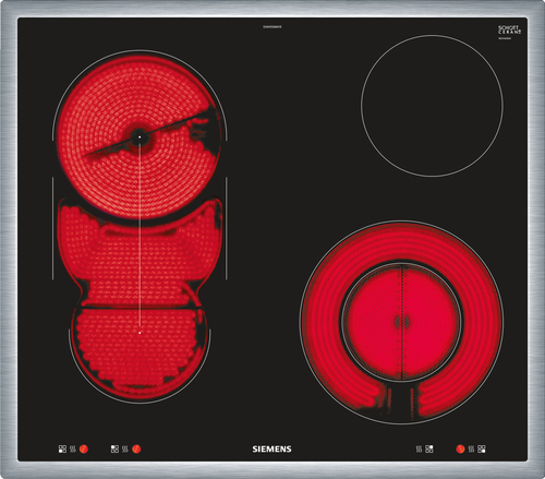Siemens EA645GMA1E. Colore del prodotto: Nero, Acciaio inox, Posizionamento dell'apparecchio: Da incasso, Tipo di piano cottura: Ceramica. Tipo di controllo: Touch. Potenza aggregata (elettrica): 7100 W, Frequenza di ingresso AC: 50 - 60 Hz. Larghezza: 583 mm, Profondità: 513 mm, Altezza: 43 mm
