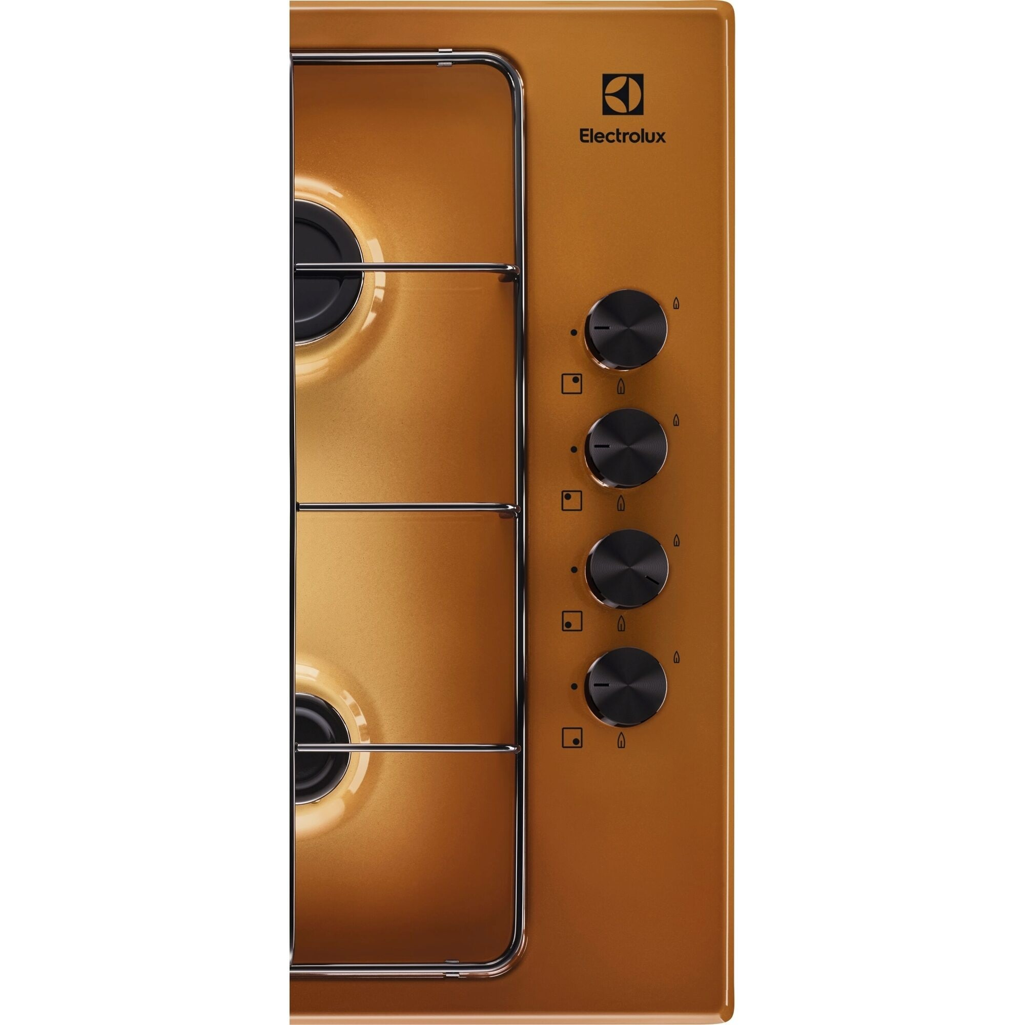 Electrolux EGS6414T Piano cottura a gas Serie 300 Slim side control 60cm. Colore del prodotto: Ottone, Posizionamento dell'apparecchio: Da incasso, Dimensione della larghezza del piano cottura: 60 cm. Tipo di controllo: Manopola, Posizione di controllo: In alto a destra. Potenza aggregata (gas): 9000 W, Tensione di ingresso AC: 220-240 V, Frequenza di ingresso AC: 50 - 60 Hz. Larghezza: 594 mm, Profondità: 510 mm, Larghezza del compartimento: 55 cm. Larghezza imballo: 670 mm, Profondità imballo: 592 mm, Altezza imballo: 152 mm