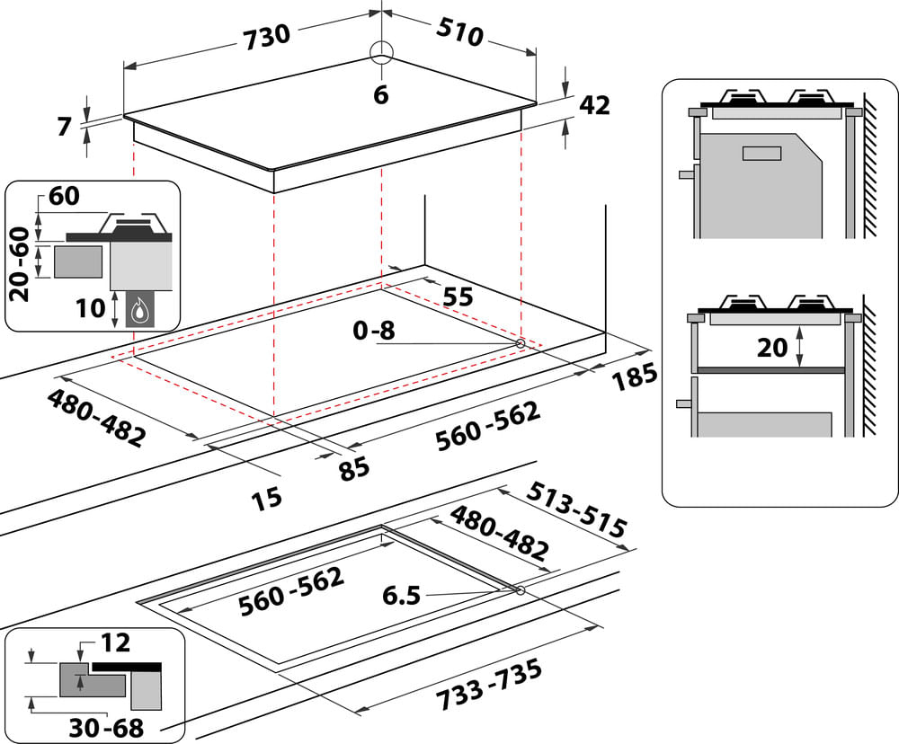| Dimensione della larghezza del piano cottura | 73 cm |