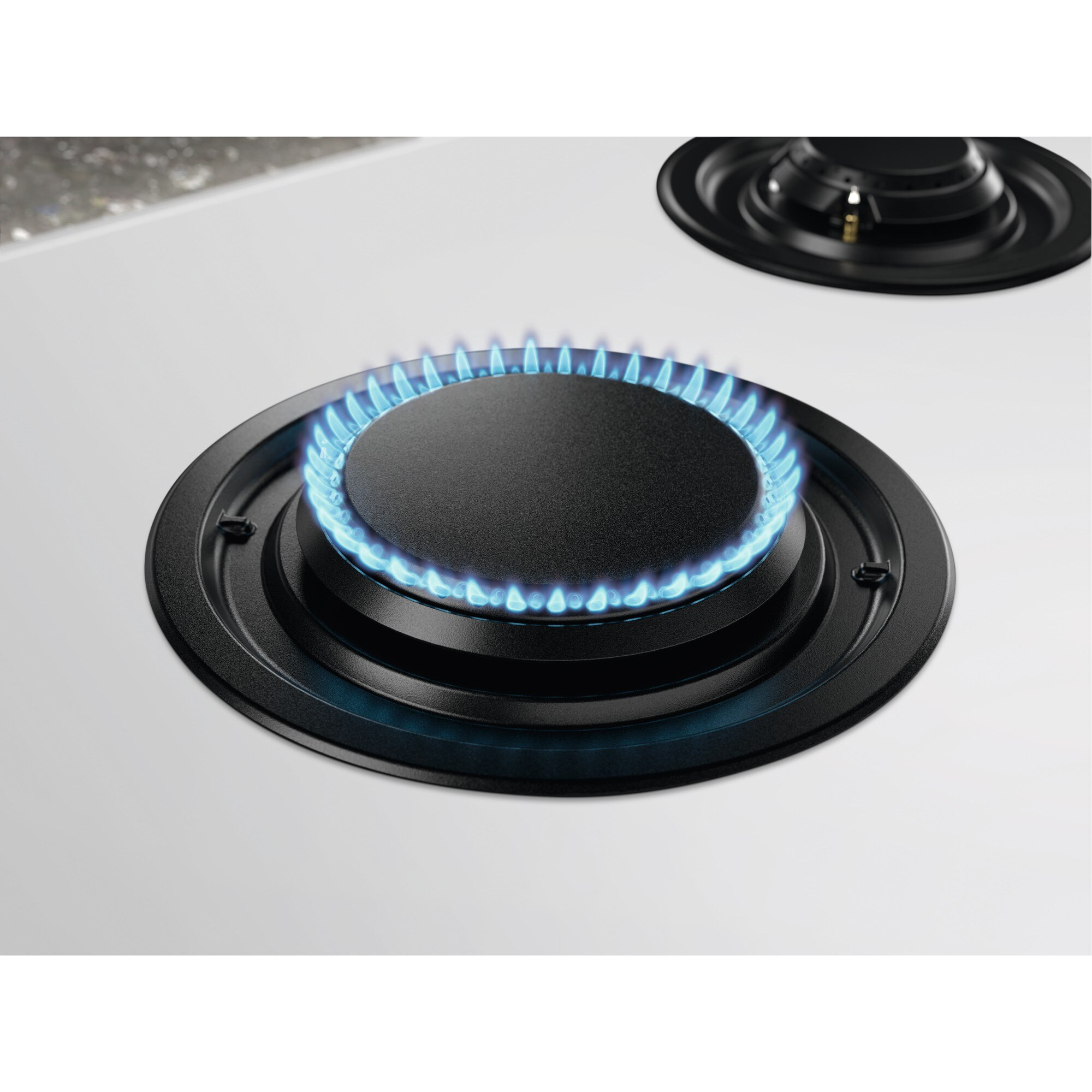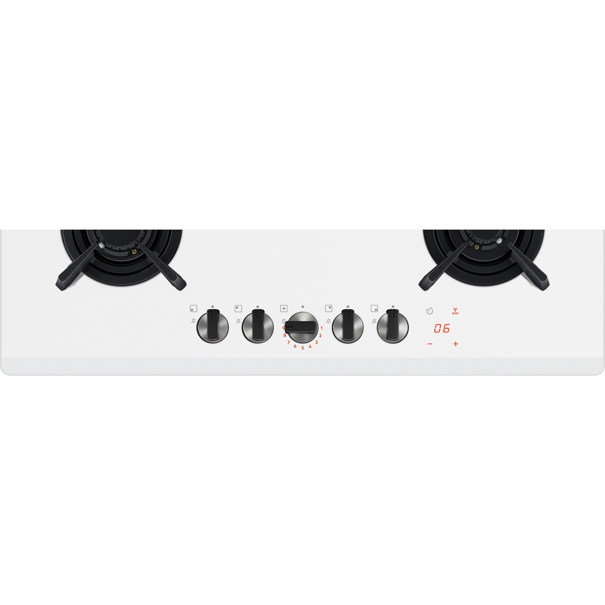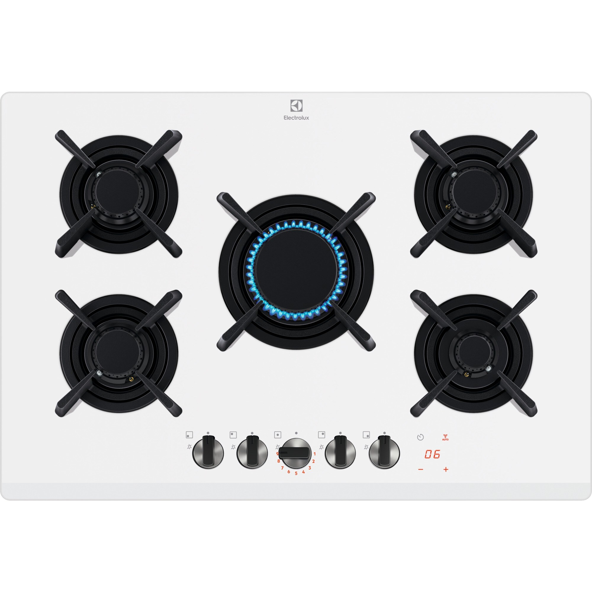 Electrolux KGG753753W Piano cottura Serie 800 Flamelight 75cm. Colore del prodotto: Bianco, Posizionamento dell'apparecchio: Da incasso, Dimensione della larghezza del piano cottura: 75 cm. Tipo di controllo: Manopola, Touch, Posizione di controllo: Frontale, Tipo di display: LED. Potenza aggregata (gas): 10350 W, Tensione di ingresso AC: 220-240 V, Frequenza di ingresso AC: 50-60 Hz. Larghezza: 740 mm, Profondità: 510 mm, Altezza: 30 mm. Larghezza imballo: 851 mm, Profondità imballo: 626 mm, Altezza imballo: 160 mm