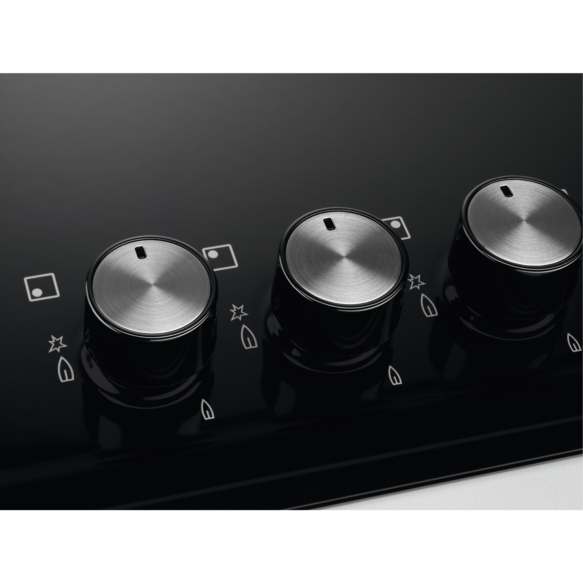 Electrolux PN640RUV Piano cottura a gas Serie 300 Soft line 60cm. Colore del prodotto: Nero, Posizionamento dell'apparecchio: Da incasso, Dimensione della larghezza del piano cottura: 59.4 cm. Tipo di controllo: Manopola, Posizione di controllo: Frontale superiore. Potenza aggregata (gas): 9000 W, Tensione di ingresso AC: 220-240 V. Larghezza: 594 mm, Profondità: 510 mm, Peso: 8,3 kg. Larghezza imballo: 710 mm, Profondità imballo: 620 mm, Altezza imballo: 170 mm