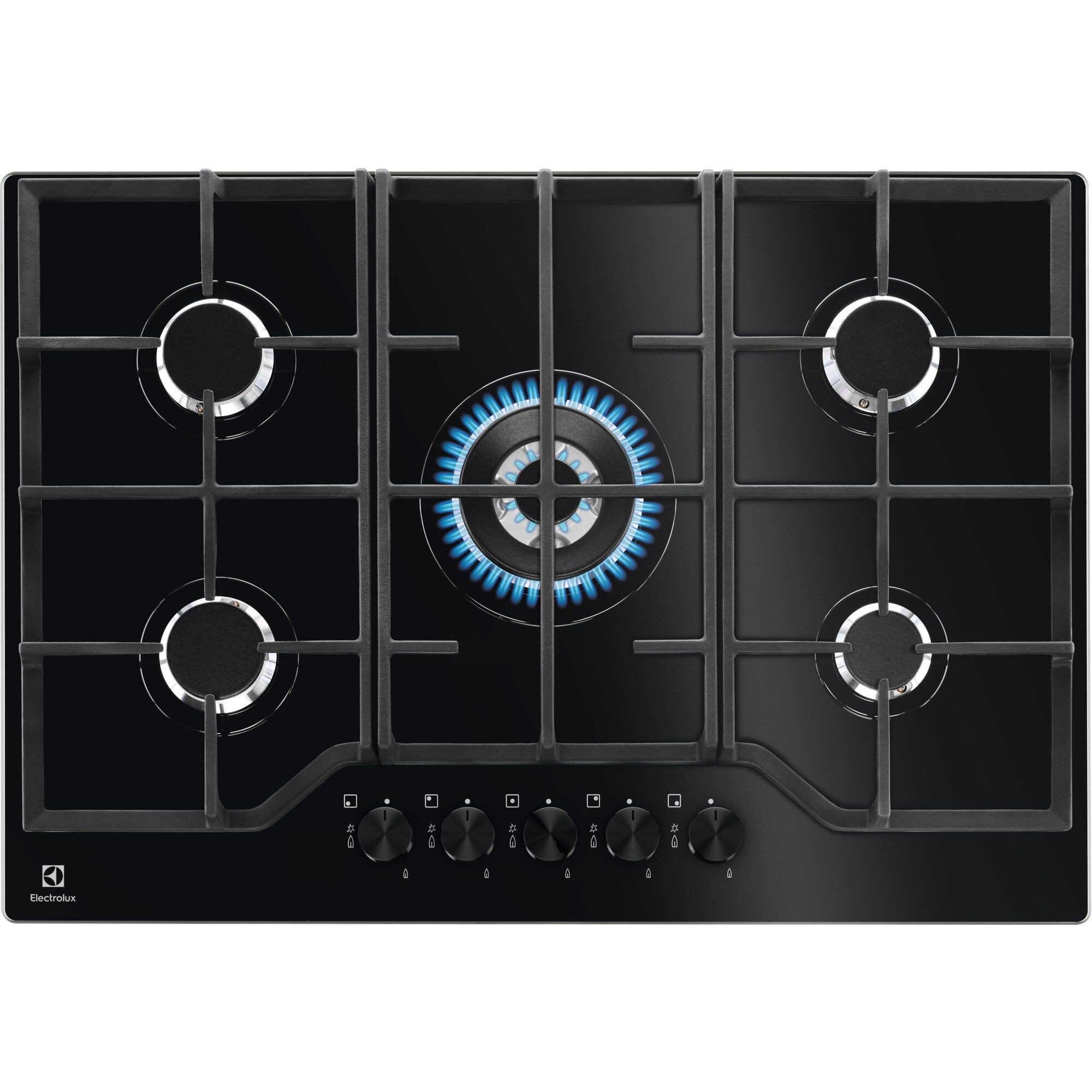 Electrolux EGG7536K Piano cottura Serie 600 Gas on Glass 75cm. Colore del prodotto: Nero, Posizionamento dell'apparecchio: Da incasso, Dimensione della larghezza del piano cottura: 75 cm. Tipo di controllo: Manopola, Posizione di controllo: Frontale. Potenza aggregata (gas): 10900 W, Tensione di ingresso AC: 220-240 V, Frequenza di ingresso AC: 50 - 60 Hz. Larghezza: 740 mm, Profondità: 510 mm, Altezza sotto il piano di lavoro: 4,5 cm. Larghezza imballo: 851 mm, Profondità imballo: 626 mm, Altezza imballo: 160 mm