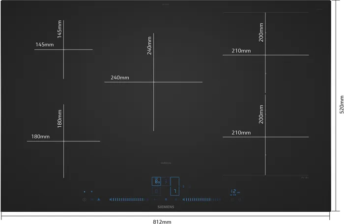 Siemens iQ700 EX87BNVV6E. Colore del prodotto: Nero, Posizionamento dell'apparecchio: Da incasso, Dimensione della larghezza del piano cottura: 80 cm. Tipo di controllo: Touch, Posizione di controllo: In alto a destra / a sinistra, Tipo di timer: Digitale. Potenza aggregata (elettrica): 7400 W, Tensione di ingresso AC: 220 - 240 V, Frequenza di ingresso AC: 50 - 60 Hz. Tecnologie Siemens (cottura): fryingSensor. Larghezza: 812 mm, Profondità: 520 mm, Altezza: 51 mm