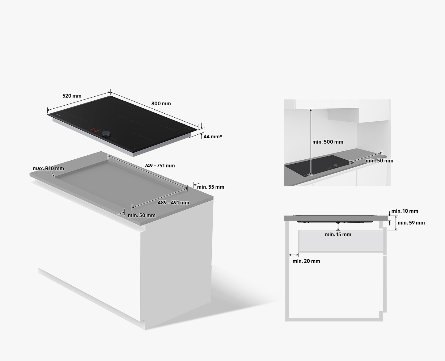 * Confronto con il modello NZ84F7NC6AB/ET. Lo spessore del piano cottura è ridotto da 56 mm a 48 mm e lo spessore minimo del piano di lavoro è ridotto da 20 cm a 10 mm.