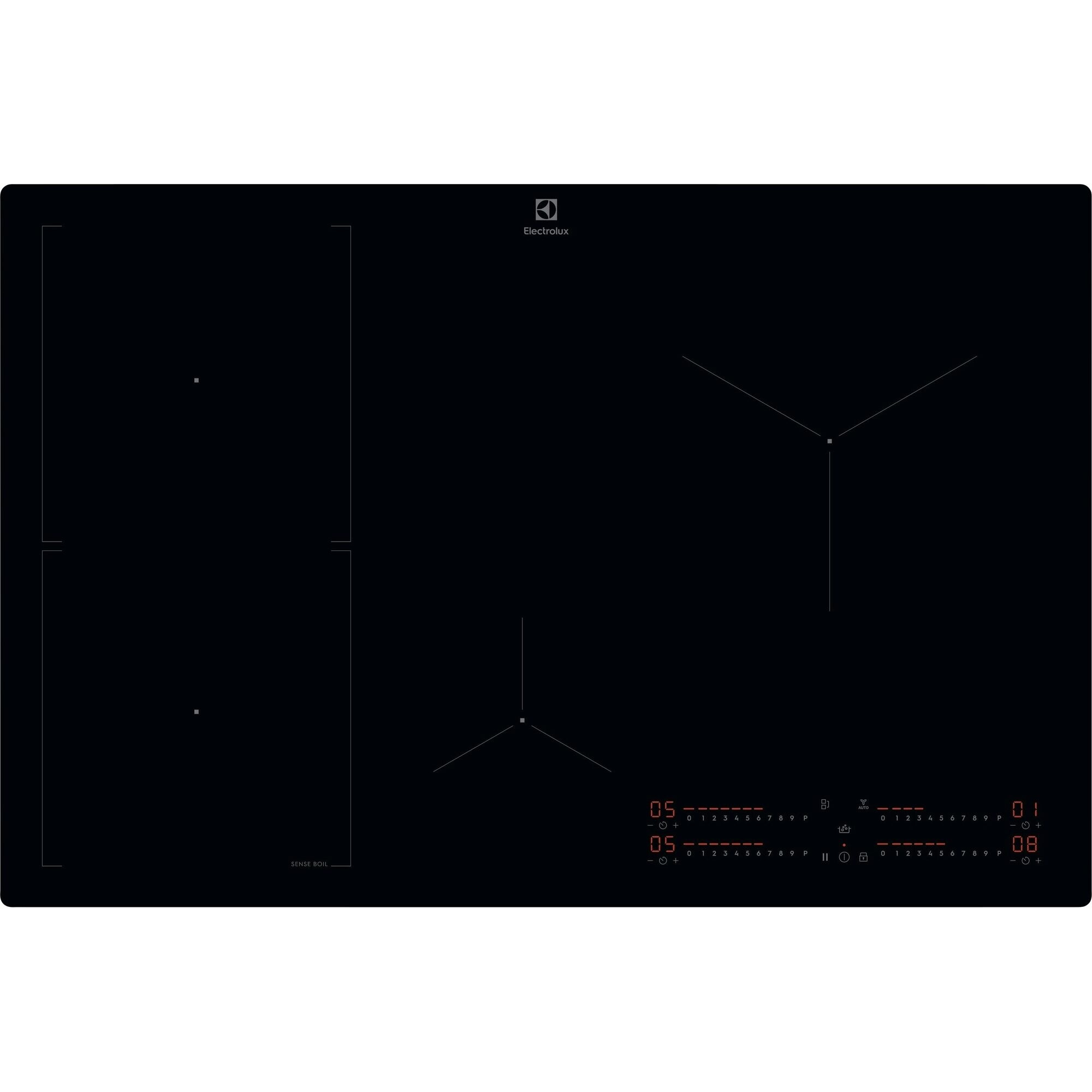 Electrolux Serie 700 KIS82453I Piano cottura ad induzione SenseBoil® 80cm. Colore del prodotto: Nero, Posizionamento dell'apparecchio: Da incasso, Dimensione della larghezza del piano cottura: 77 cm. Tipo di controllo: Touch, Posizione di controllo: Parte anteriore destra, Tipo di timer: Digitale. Potenza aggregata (elettrica): 7350 W, Tensione di ingresso AC: 220-240 V. Larghezza: 770 mm, Profondità: 510 mm, Peso: 11,6 kg. Larghezza imballo: 868 mm, Profondità imballo: 600 mm, Altezza imballo: 118 mm