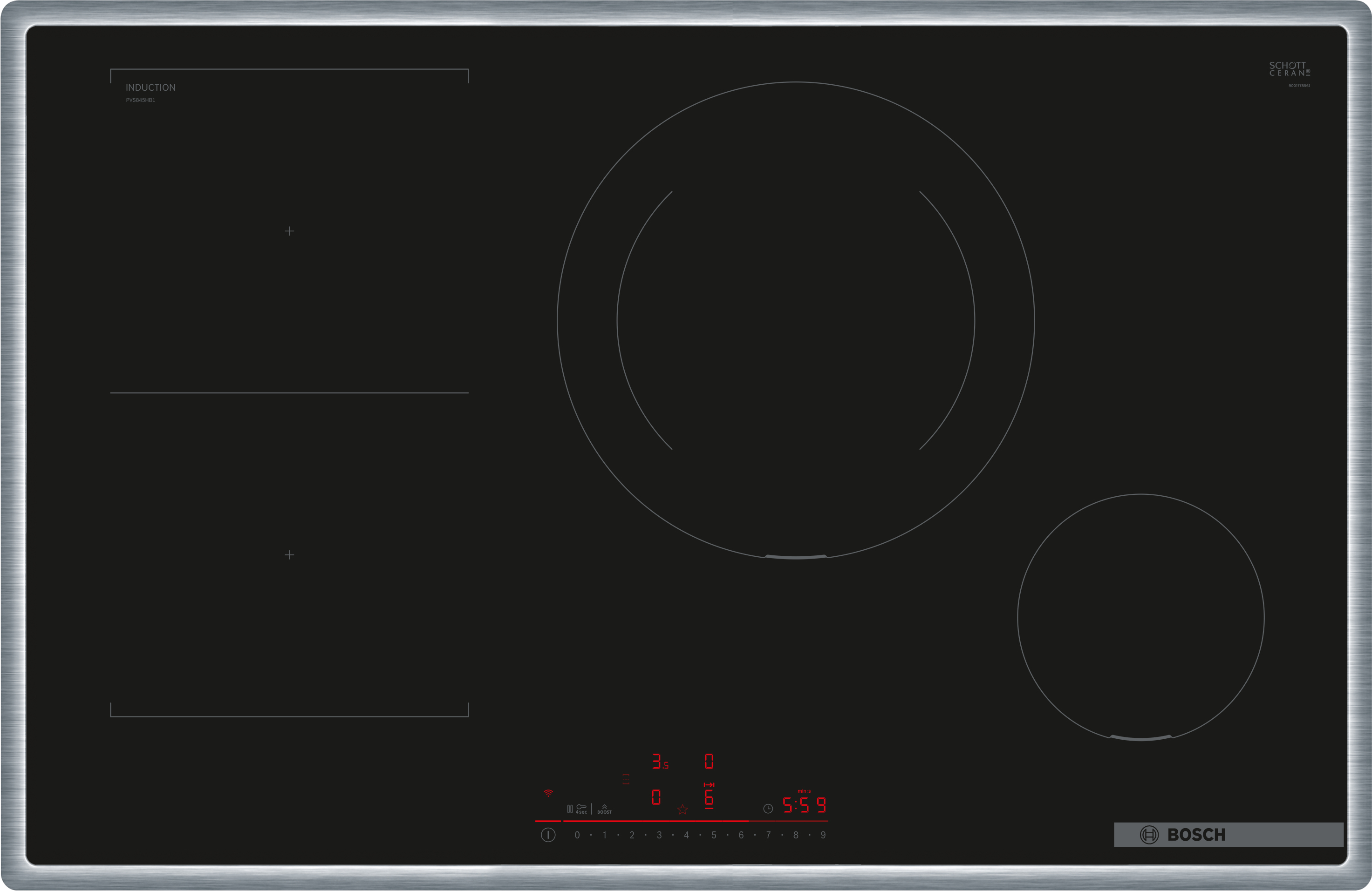Bosch Serie 6 PVS845HB1E Piano cottura a induzione 80 cm CombInduction Nero. Colore del prodotto: Nero, Posizionamento dell'apparecchio: Da incasso, Dimensione della larghezza del piano cottura: 80 cm. Tipo di controllo: Touch, Posizione di controllo: Frontale, Tipo di orologio: Elettronico. Potenza aggregata (elettrica): 7400 W. Larghezza: 802 mm, Profondità: 523 mm, Altezza: 55 mm. Larghezza imballo: 953 mm, Profondità imballo: 608 mm, Altezza imballo: 126 mm