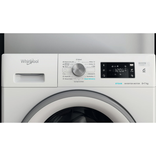 Whirlpool FFWDB 976258 SV EE. Tipo di carica: Caricamento frontale, Posizionamento dell'apparecchio: Libera installazione, Colore del prodotto: Bianco. Capacità di asciugatura: 9 kg, Velocità di centrifuga massima: 1600 Giri/min, Classe di efficienza della centrifuga: A. Lunghezza cavo: 1,2 m. Classe di efficienza energetica (lavaggio): B, Classe di efficienza energetica( lavaggio e asciugatura): E, Consumo di acqua (lavaggio): 50 L. Profondità: 605 mm, Larghezza: 595 mm, Altezza: 850 mm