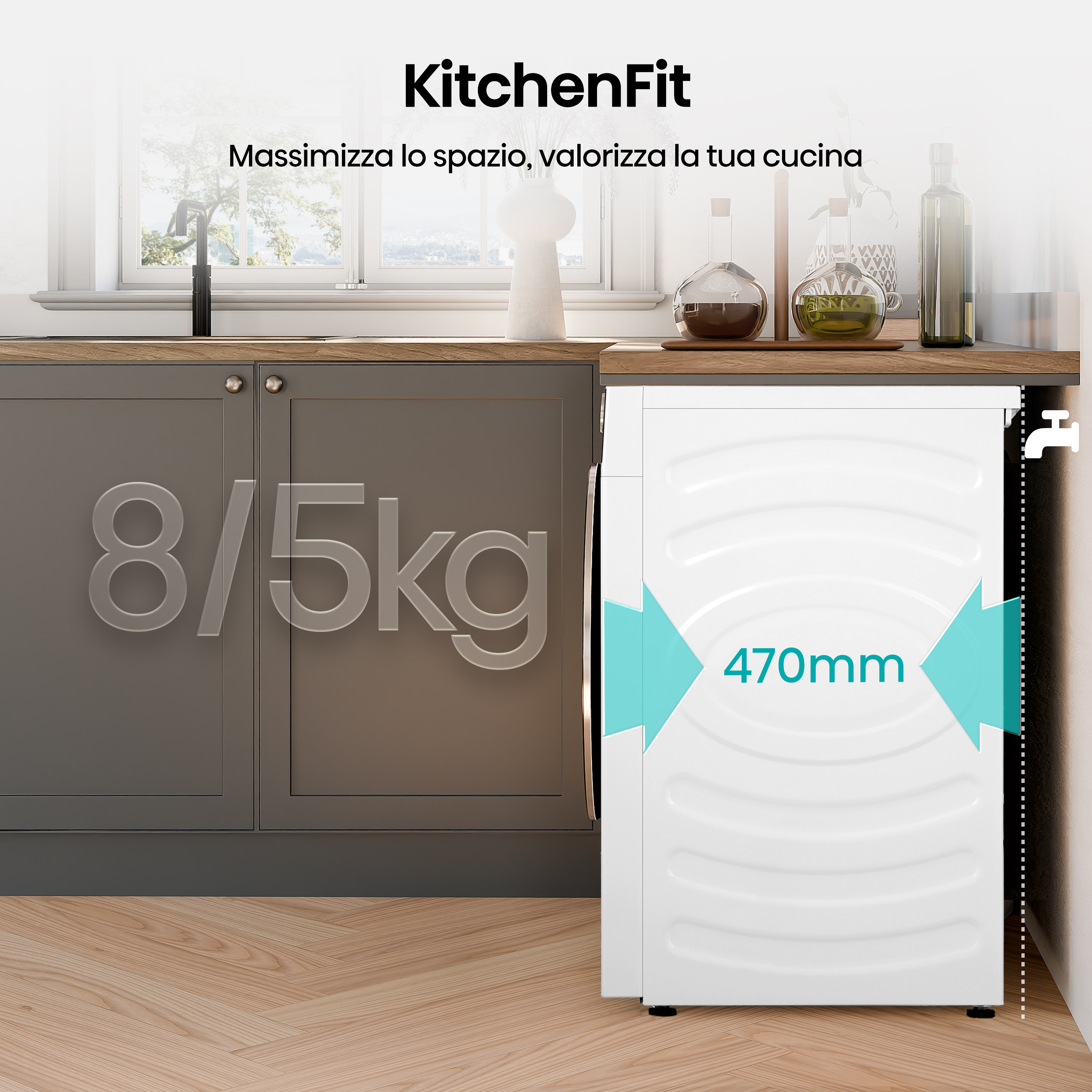 Hisense WD5I8043BWF. Tipo di carica: Caricamento frontale, Posizionamento dell'apparecchio: Libera installazione, Colore del prodotto: Bianco. Capacità di asciugatura: 5 kg, Velocità di centrifuga massima: 1400 Giri/min, Classe di efficienza della centrifuga: B. Angolo di apertura della porta: 135°. Classe di efficienza energetica (lavaggio): A, Classe di efficienza energetica( lavaggio e asciugatura): D, Consumo di acqua (lavaggio): 38 L. Profondità: 470 mm, Larghezza: 595 mm, Altezza: 845 mm