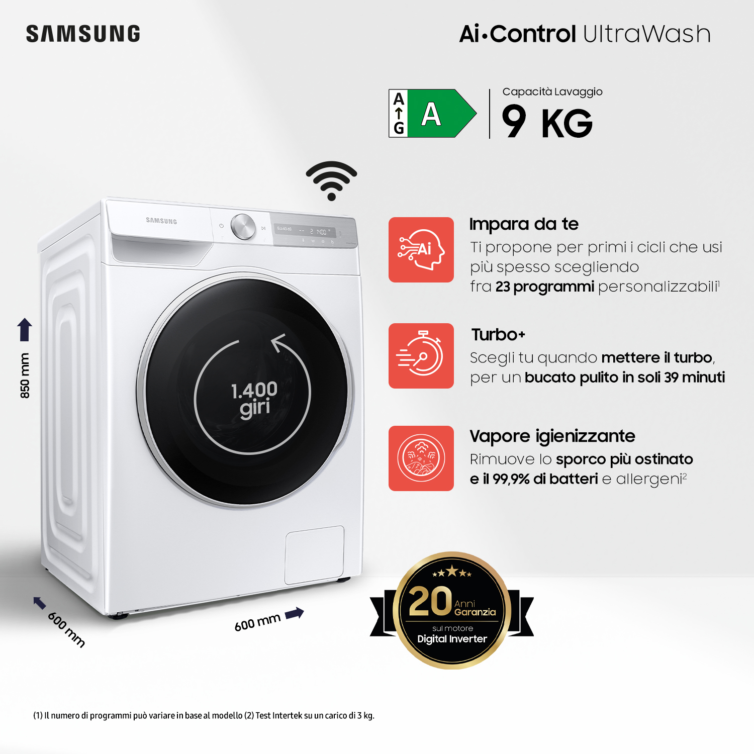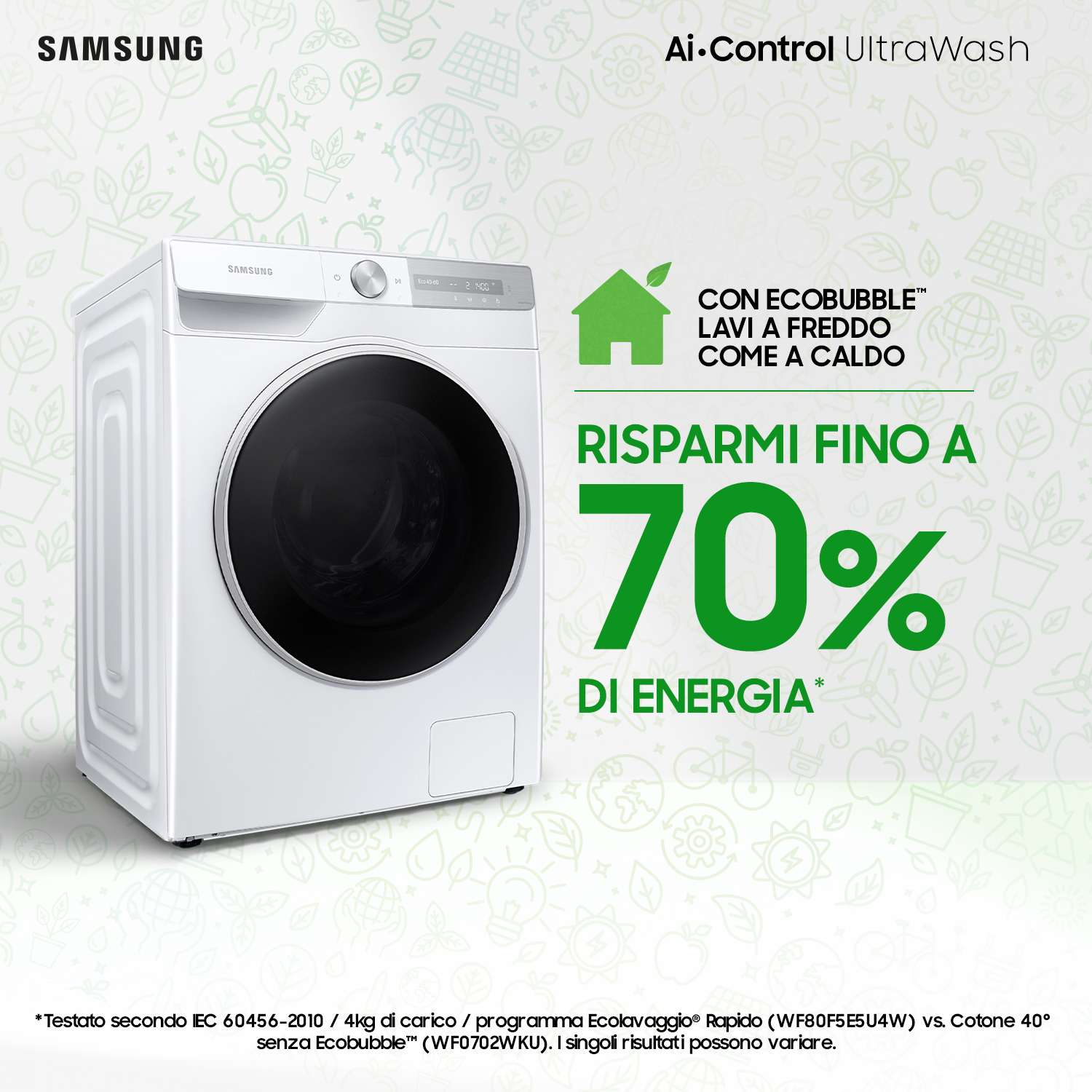 Tieni sotto controllo e riduci il consumo elettrico della tua lavatrice. Con AI Energy Mode[3] puoi verificare facilmente i consumi ed effettuare una stima della bolletta. In più, con lopzione Risparmio Massimo[4] , i consumi si riducono fino al 70%[5] grazie alla tecnologia Ecobubble™.