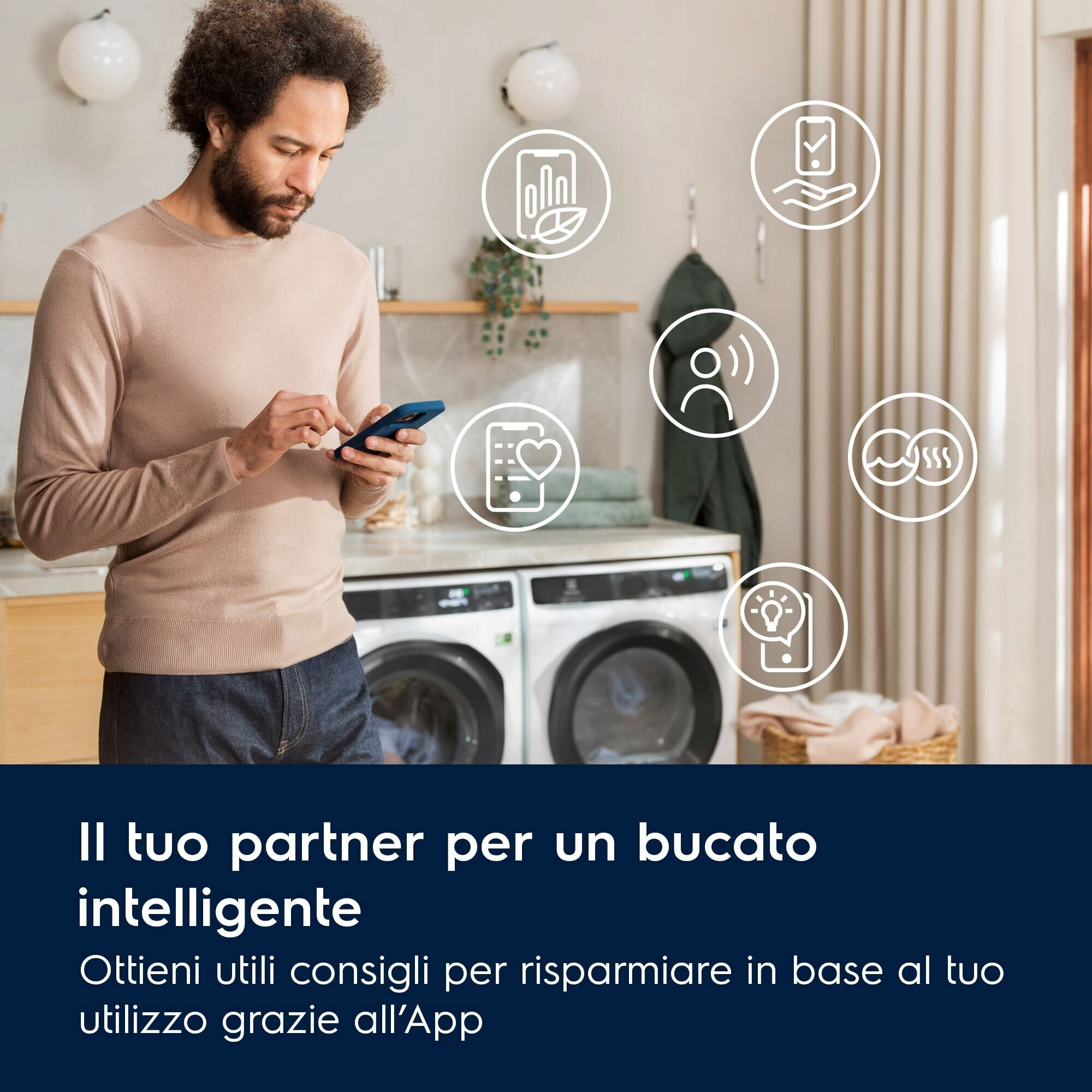 Collega il tuo apparecchio all'app Electrolux per goderti il controllo da remoto. Ottieni aggiornamenti in tempo reale, consigli per risparmiare risorse e suggerimenti per la longevità dei capi. Grazie alla connettività sperimenta una cura dei vestiti più intelligente e su misura.