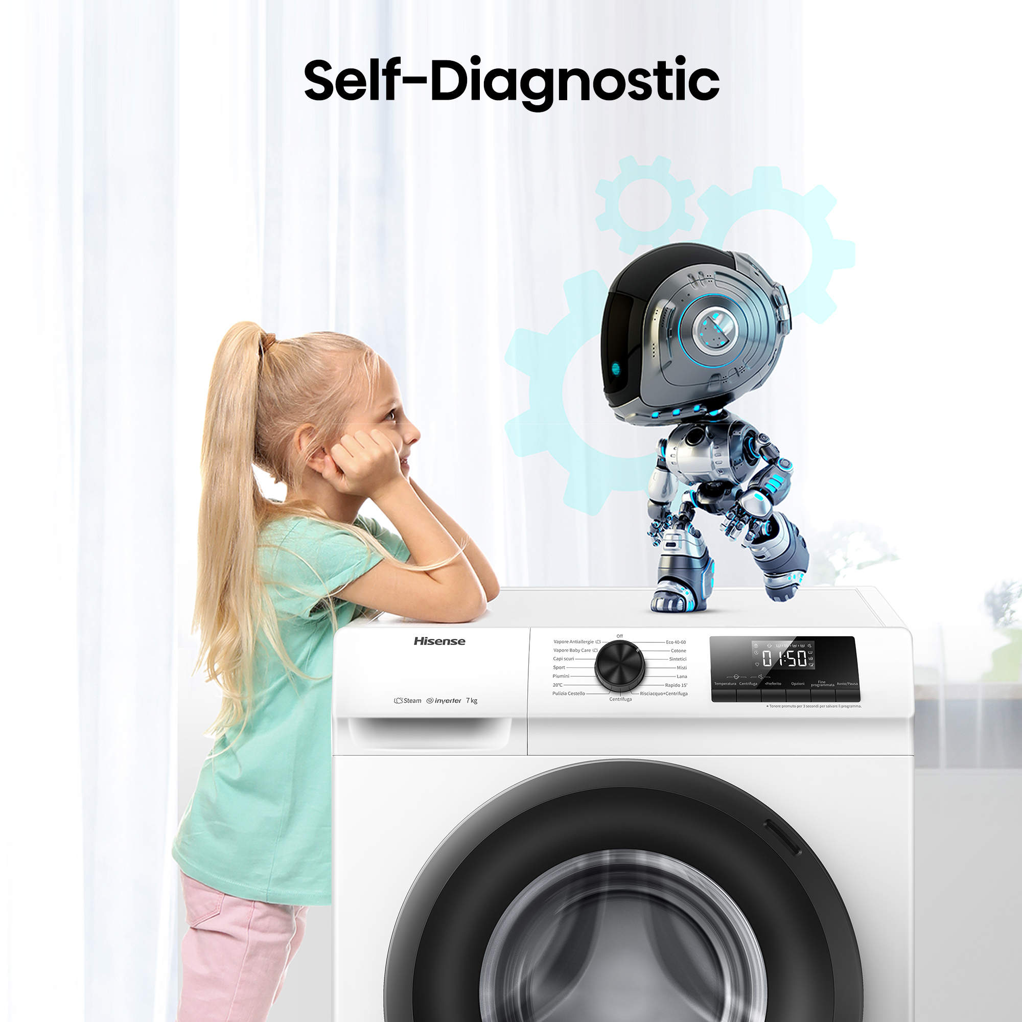 •Autodiagnosi: Nel caso di un malfunzionamento, gli strumenti di autodiagnosi ti notificheranno immediatamente con un codice di errore univoco che puoi trovare facilmente nel manuale utente. Ciò rende la risoluzione dei problemi rapida e comoda, risparmiandoti tempo e stress e assicurandoti che sia tu che il tuo elettrodomestico siate al sicuro e protetti.