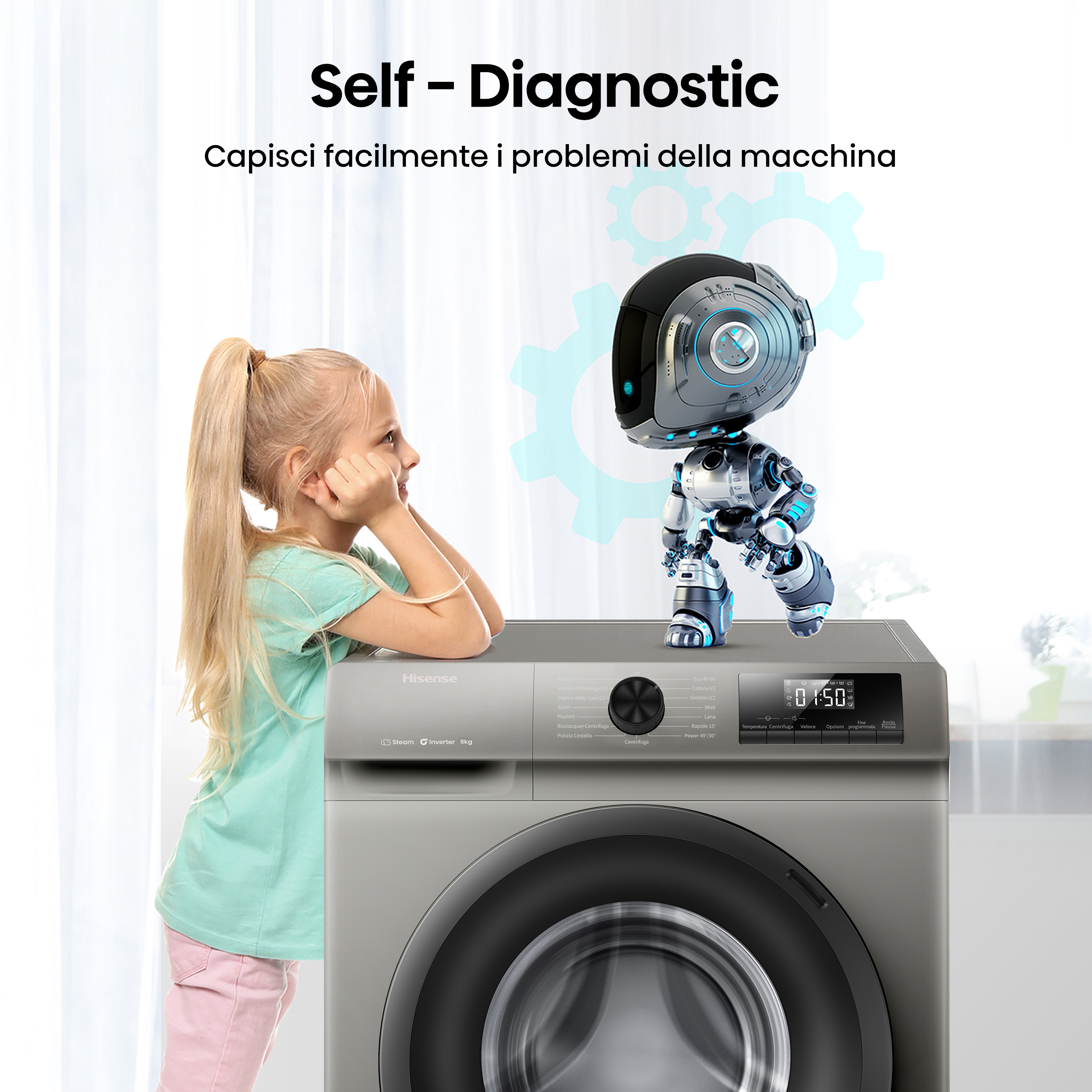 •Autodiagnosi: In caso di malfunzionamento, gli strumenti di autodiagnosi ti notificheranno immediatamente con un codice di errore univoco che puoi trovare facilmente nel manuale utente. Ciò rende la risoluzione dei problemi rapida e comoda, risparmiandoti tempo e stress e assicurandoti che sia tu che il tuo elettrodomestico siate al sicuro e protetti.