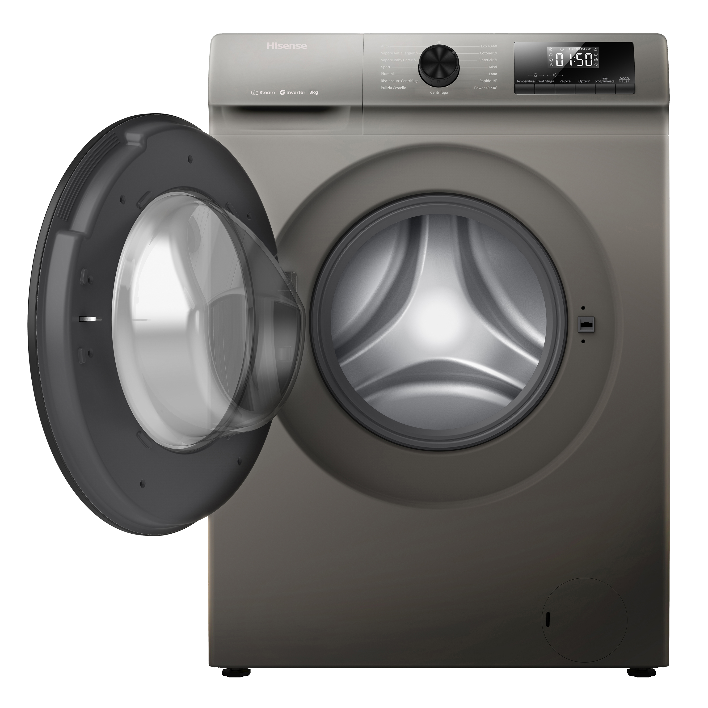 Hisense lavatrice WF1Q8041BT 8 Kg Classe A Quick Wash Partenza Ritardata Inverter. Tipo di carica: Caricamento frontale. Capacità cestello: 8 kg, Classe di efficienza della centrifuga: B, Silenziosità (centrifuga): 74 dB, Velocità di centrifuga massima: 1400 Giri/min. Colore del prodotto: Grigio. Larghezza: 600 mm, Profondità: 540 mm, Altezza: 850 mm. Classe efficienza energetica: A