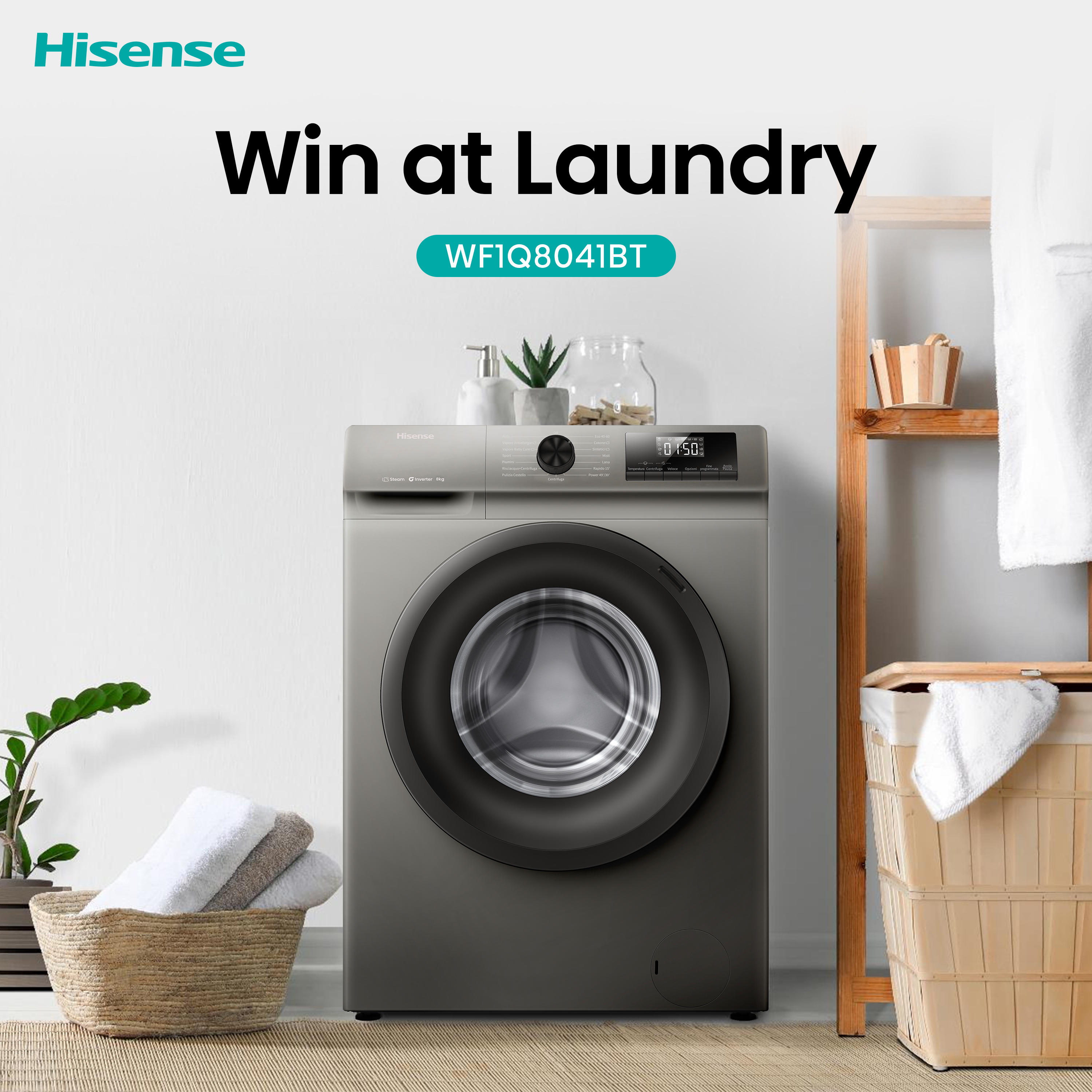 Hisense WF1Q8041BT è una lavatrice da 8 Kg con classe energetica A.. Grazie al motore Inverter, offre lavaggi potenti, silenziosi e a basso consumo energetico (Classe A). Il programma Quick Wash permette di lavare i capi in soli minuti, perfetto per chi ha poco tempo. Con la partenza ritardata, puoi programmare il ciclo quando preferisci, ottimizzando tempo ed energia. Design moderno, funzioni intuitive e risultati impeccabili ad ogni lavaggio.