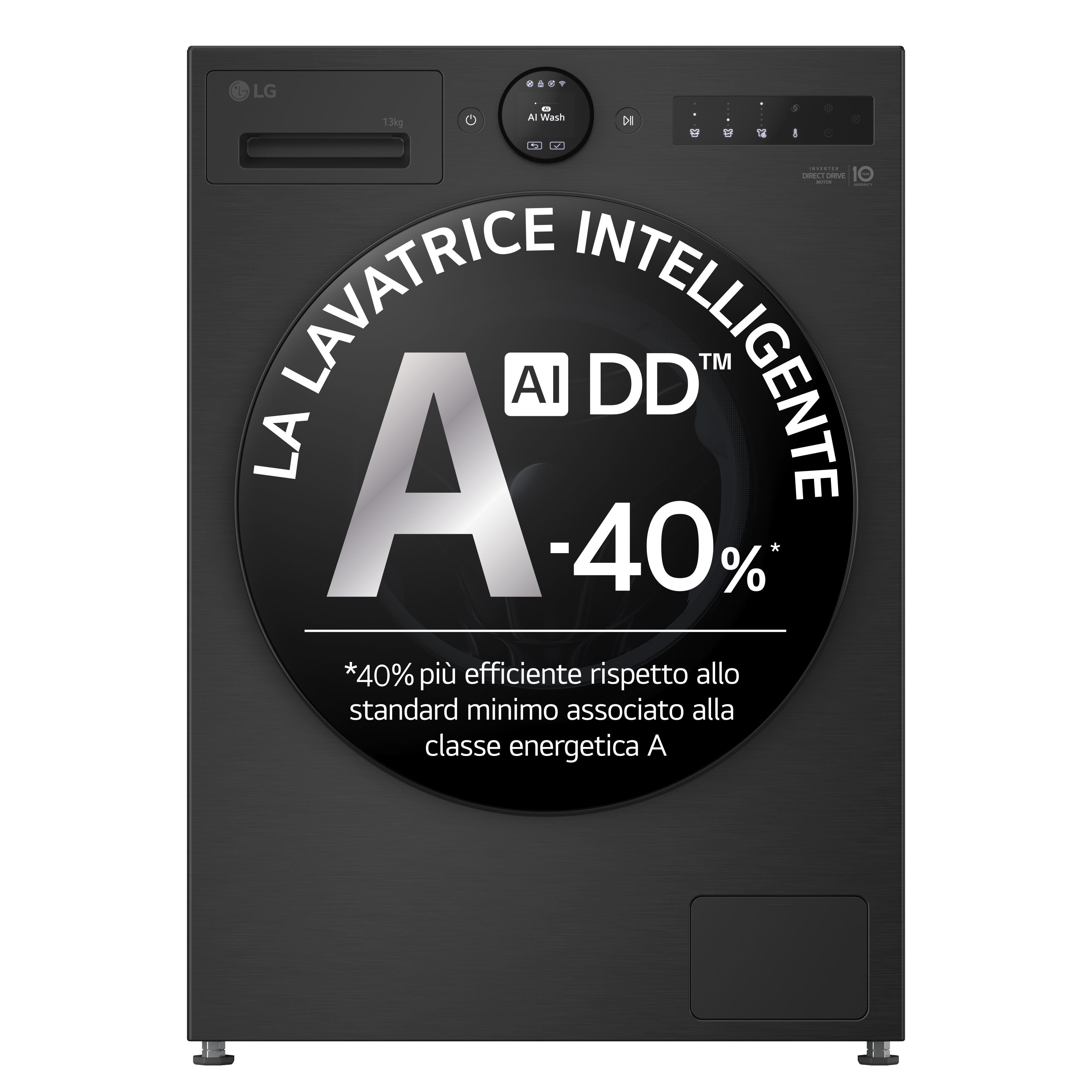 LG F4X7013TBB Lavatrice 13kg AI DD™ Serie X7, Classe A-40%, 1400 giri, Display Easy Circle, Wi-Fi, AI Wash, TurboWash. Tipo di carica: Caricamento frontale. Capacità cestello: 13 kg, Classe di efficienza della centrifuga: B, Silenziosità (centrifuga): 71 dB, Velocità di centrifuga massima: 1400 Giri/min. Colore del prodotto: Nero. Larghezza: 600 mm, Profondità: 615 mm, Altezza: 850 mm. Classe efficienza energetica: A