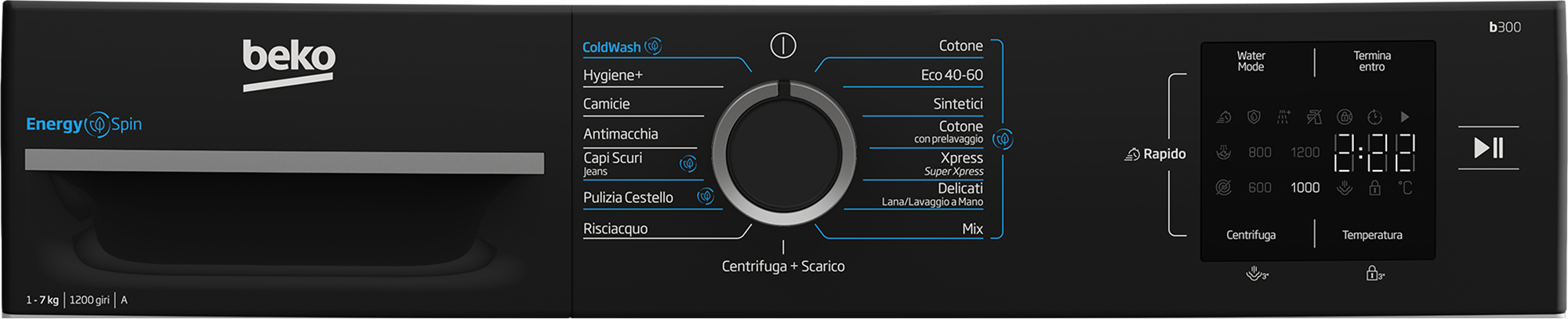 Beko b300 BMWSEP7126EB, Lavatrice 7kg Slim, classe A-10%, 1200giri, Display digitale, tecnologia EnergySpin™, funzione a vapore. Tipo di carica: Caricamento frontale. Capacità cestello: 7 kg, Classe di efficienza della centrifuga: B, Silenziosità (centrifuga): 74 dB, Velocità di centrifuga massima: 1200 Giri/min. Colore del prodotto: Nero, Bianco. Larghezza: 60 mm, Profondità: 496 mm, Altezza: 845 mm. Classe efficienza energetica: A