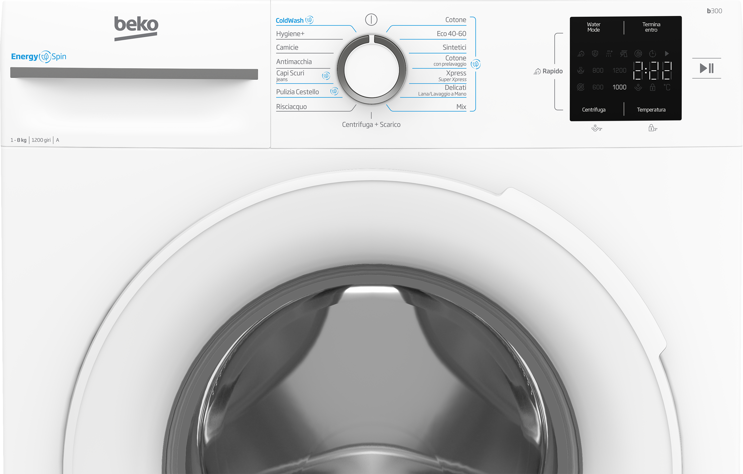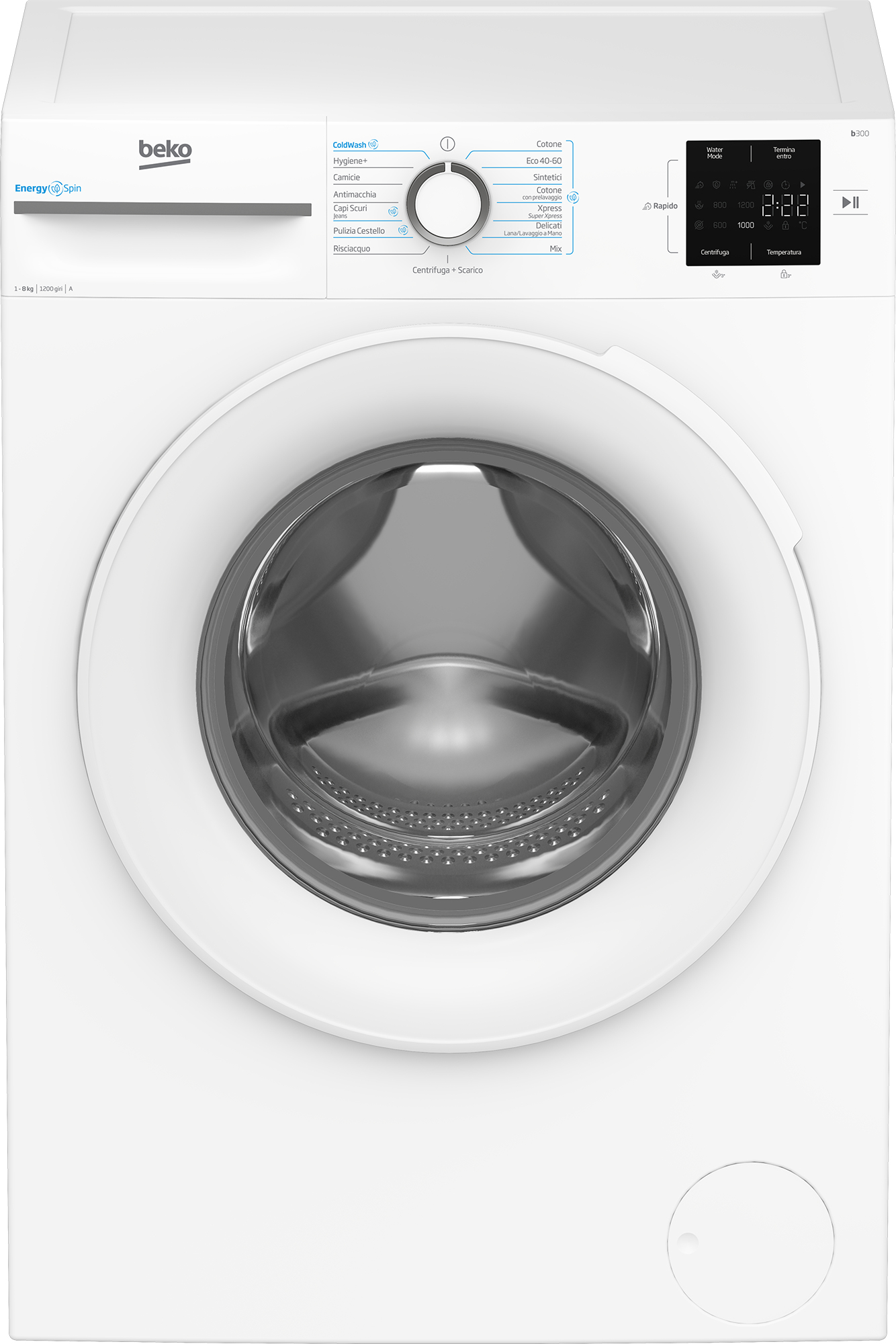 Beko b300 BMWU3821W: Lavatrice 8kg, Classe A, 1200giri, linea estetica NX, motore inverter, Display Touch, oblò bianco, tecnologia EnergySpin™