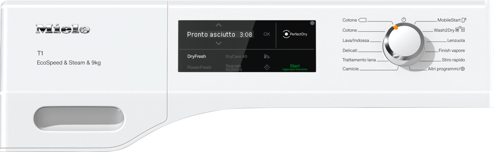 | Programmi di asciugatura | Lana, Sport, Rapido, Risciacquo, Delicati/Seta, Eco, Jeans/denim, Vapore, Cuscino, Camicia/maglietta, Cotone |