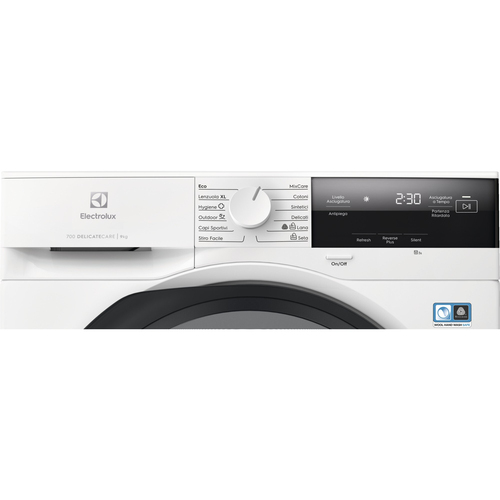 Electrolux EW7H392G Asciugatrice 700 DelicateCare 9 kg. Posizionamento dell'apparecchio: Libera installazione, Tipo di carica: Caricamento frontale, Sistema di asciugatura: Pompa di calore. Capacità cestello: 9 kg, Classe di efficienza della condensazione: C, Ciclo: 239 min. Classe efficienza energetica: D, Consumo energetico per 100 cicli: 122 kWh, Consumo energetico annuo: 1,22 kWh. Certificati di sostenibilità: Woolmark Blue. Profondità: 638 mm, Larghezza: 596 mm, Altezza: 850 mm